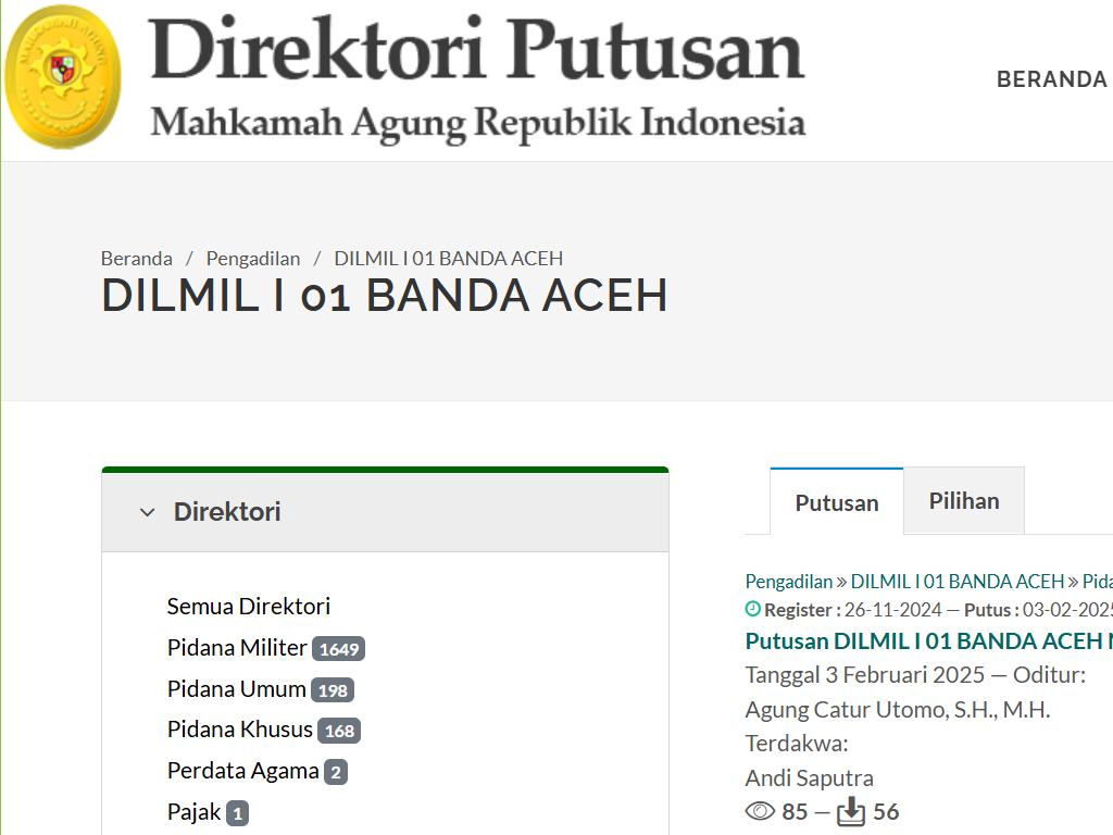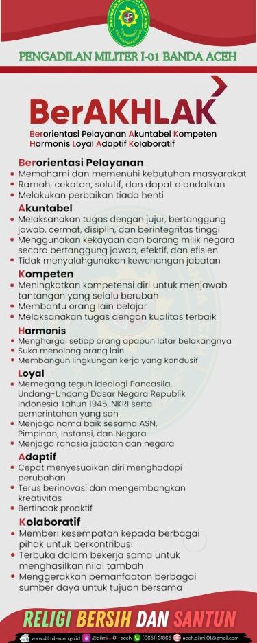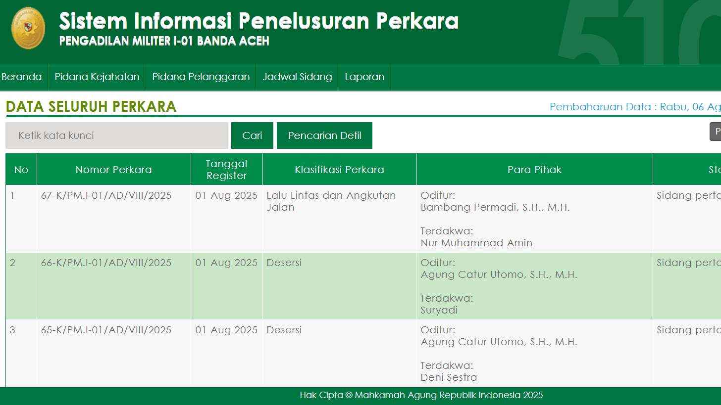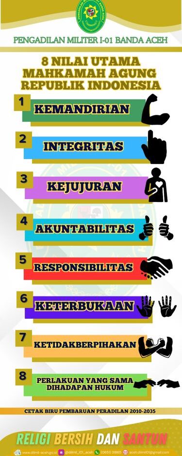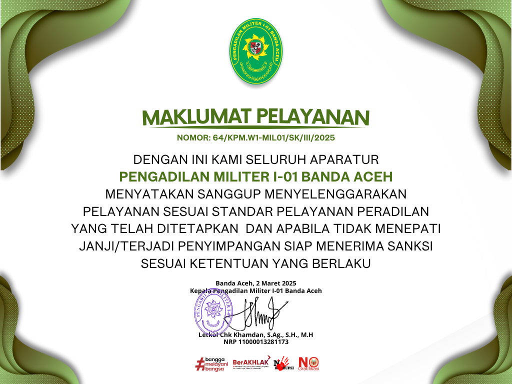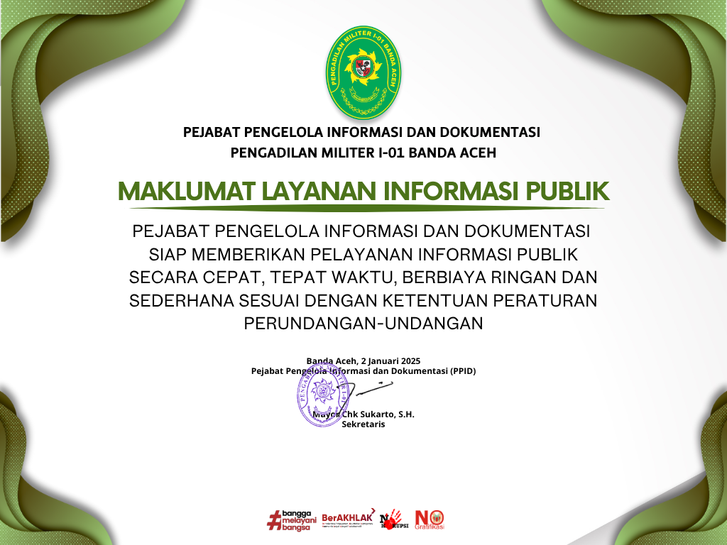 Sebagai implementasi dari prinsip keterbukaan ini, situs resmi pengadilan menjadi sarana bagi masyarakat, terutama pencari keadilan, untuk mengakses informasi seputar proses persidangan, dari awal hingga putusan, termasuk tahapan upaya hukum. Harapannya, situs Pengadilan Militer I‑01 Banda Aceh dapat memberikan manfaat maksimal bagi masyarakat dengan memenuhi kebutuhan informasi yang penting dalam konteks pengadilan. Terima kasih, salam integritas.