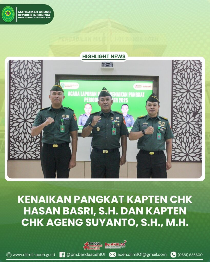 Banda Aceh – 1 Oktober 2025. Selamat dan sukses kepada Kapten Chk Hasan Basri, S.H. serta Kapten Chk Ageng Suyanto, S.H., M.H. atas kenaikan pangkat yang telah diraih.