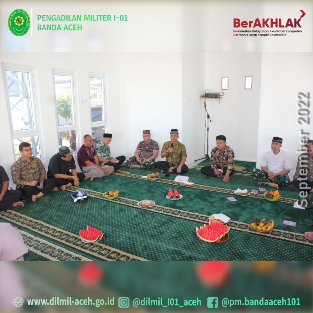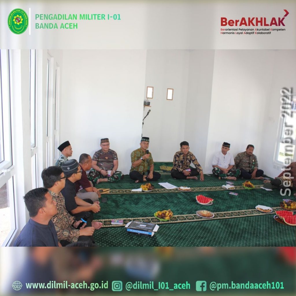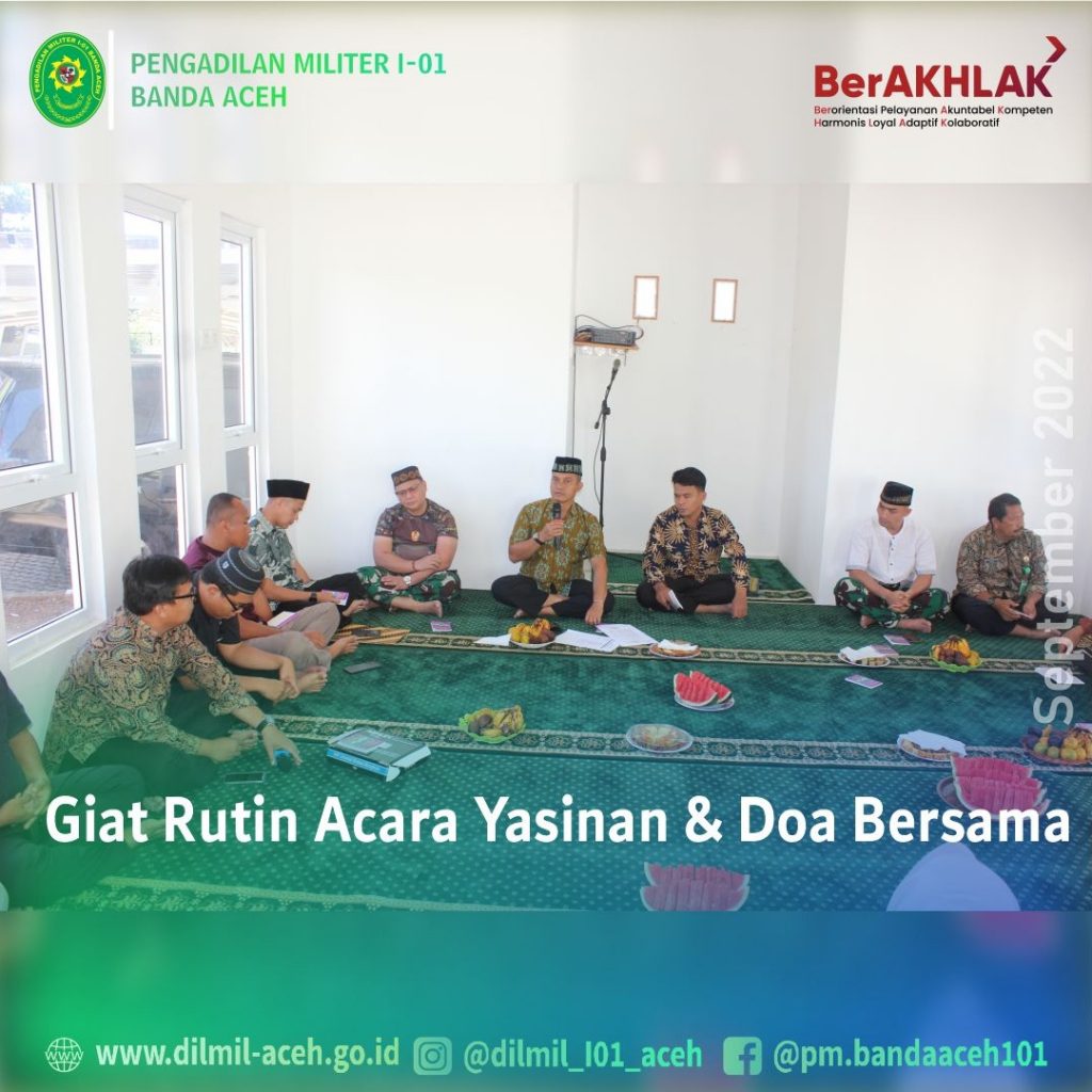 Banda Aceh – 16 September 2022, Kadilmil I-01 Banda Aceh Kolonel Chk Masykur, S.T., S.H., M.H., memimpin kegiatan rutin acara yasinan dan doa bersama di Mushalla Pengadilan Militer I-01 Banda Aceh dengan dihadiri oleh Para Anggota Pokkimmil, Para Pejabat Struktural, Pejabat Fungsional dan seluruh staf.