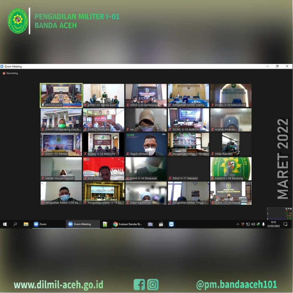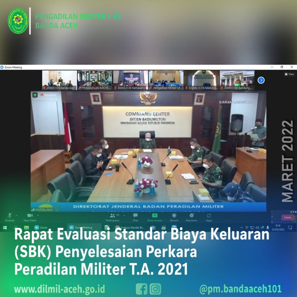 Banda Aceh – 22 Maret 2022. Sekretaris, Panmud Hukum dan Kasubbag PTIP Pengadilan Militer I-01 Banda Aceh mengikuti kegiatan Evaluasi Biaya Keluaran (SBK) penyelesaian Perkara Peradilan Militer Tahun Anggaran 2021 yang diselenggarakan oleh Dirjen Badilmiltun Mari secara daring.