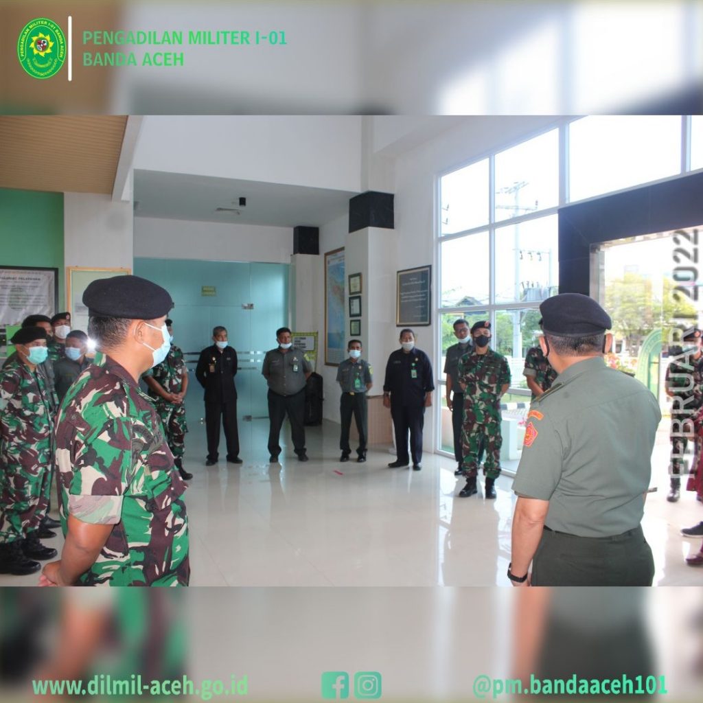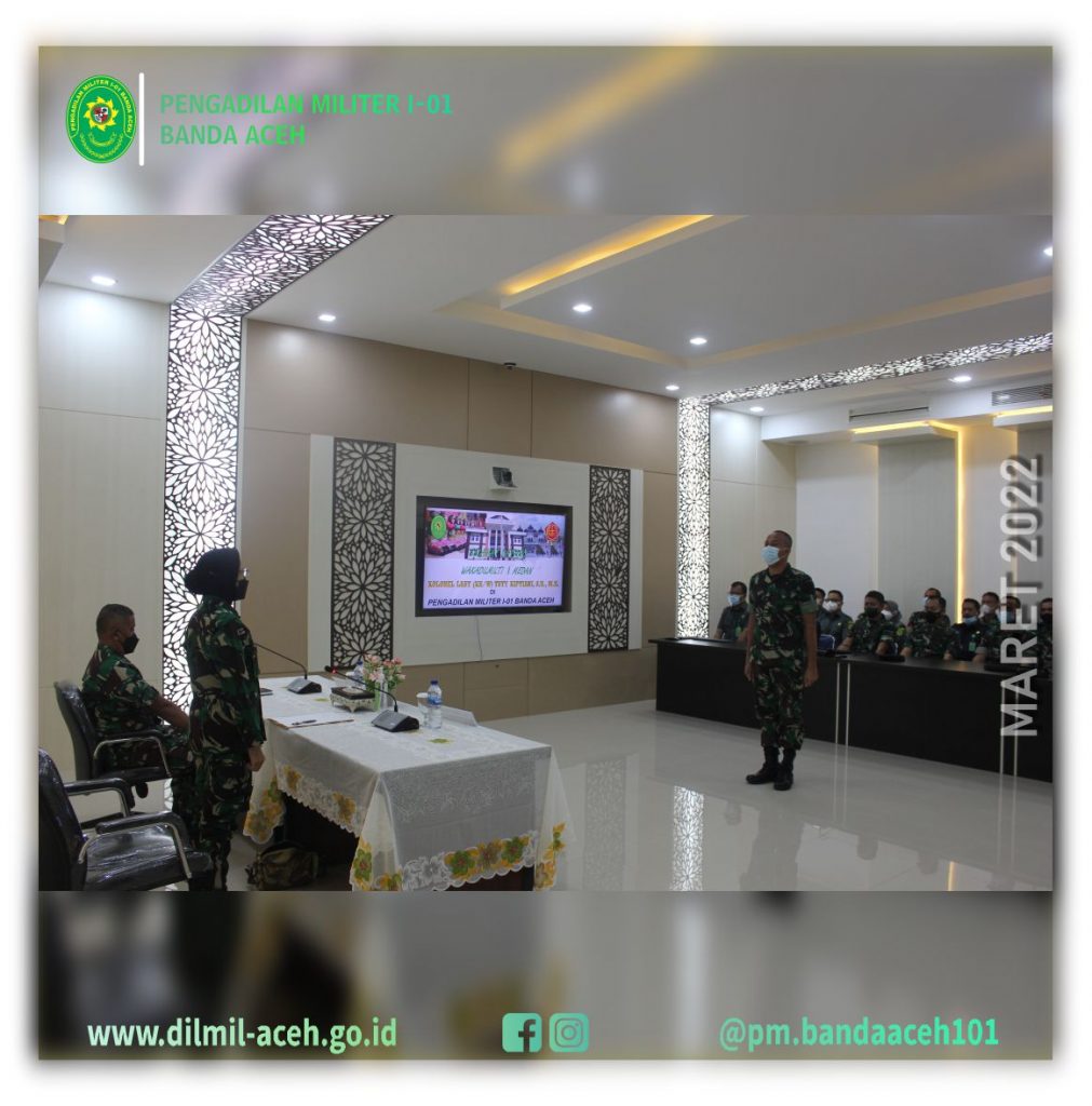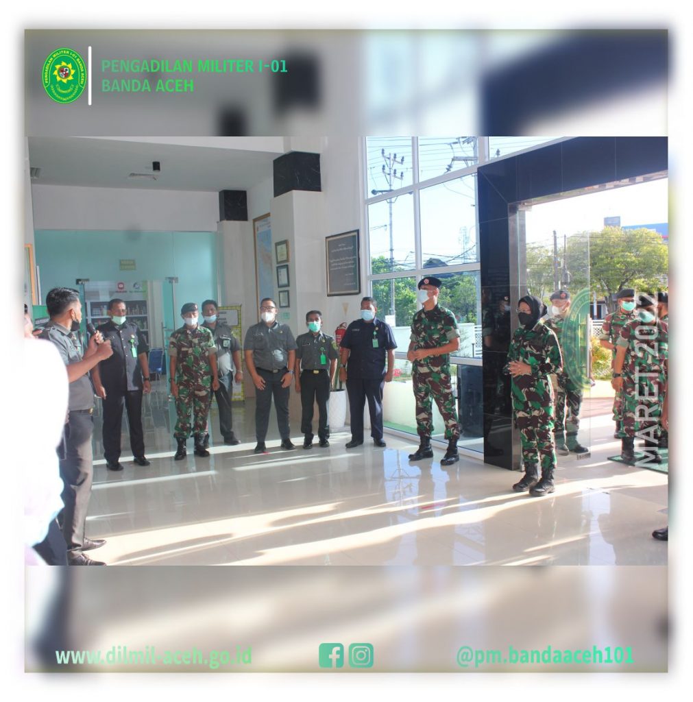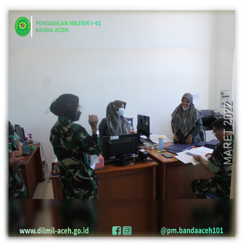 Banda Aceh – 9 Maret 2022 Pengadilan Militer Tinggi I Medan melaksanakan Pembinaan dan Pengawasan di Pengadilan Militer I-01 Banda Aceh. Tim Binwas yang dipimpin langsung oleh Wakil Kepala Pengadilan Militer Tinggi I Medan Kolonel Laut (KH/W) Tuty Kiptiani, S.H., M.H. didampingi Panitera Pengganti Pengadilan Militer Tinggi I Medan Mayor Chk Tedy Markopolo, S.H., dan Kasubbag Pelaporan dan Keuangan, ASN Ira Gustini Ginting, S.E .
