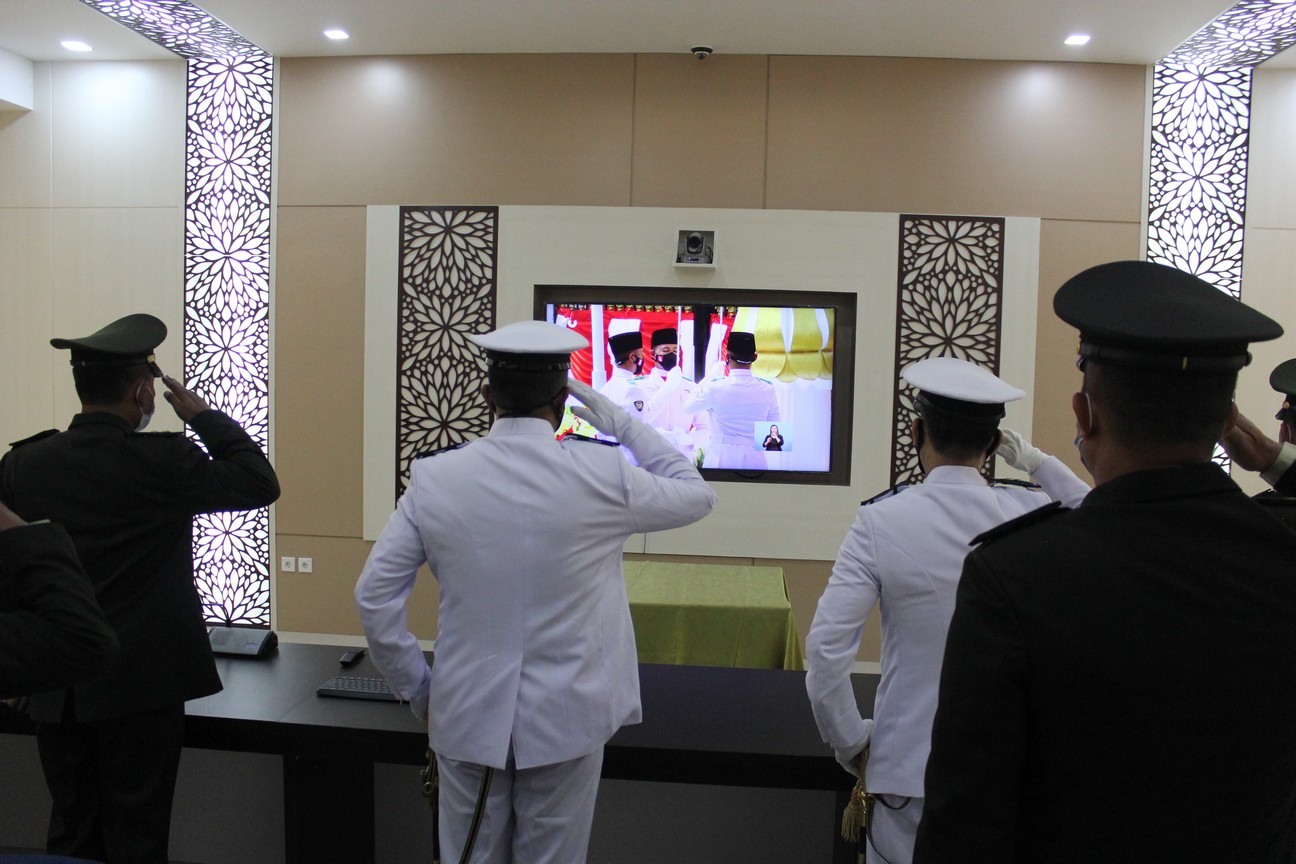 Banda Aceh – 17 Agustus 2021 Pengadilan Militer I-01 Banda Aceh melaksanakan upacara secara virtual memperingati HUT RI ke-76 bertempat di ruang Auditorium Pengadilan Militer I-01 Banda Aceh. Upacara berlangsung pada pukul 10.00 WIB, dengan tema ”Indonesia Tangguh Indonesia Tumbuh” dihadiri oleh Kepala, Hakim, Sekretaris, Panitera Muda dan Panitera Pengganti. Untuk pegawai yang tidak menghadiri upacara virtual di Pengadilan Militer I-01 Banda Aceh, juga turut serta dalam upacara virtual ini di rumah masing-masing melalui televisi. Upacara virtual digelar dengan tetap mengikuti protokoler kesehatan covid-19 dengan menjaga jarak dan dilengkapi dengan pemakaian masker.Dirgahayu Republik Indonesia ke-76.