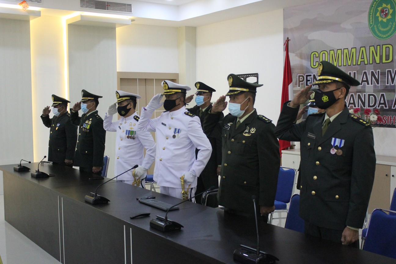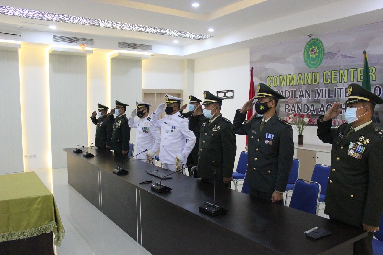 Banda Aceh – 27 Juli 2021 bertempat di Halaman Gedung Kantor Pengadilan Militer I-01 Banda Aceh beserta seluruh anggota melaksanakan Acara Tradisi penyambutan Kadilmil I-01 Banda Aceh yang baru yaitu Letkol Laut Riza Fadilah, S.H.