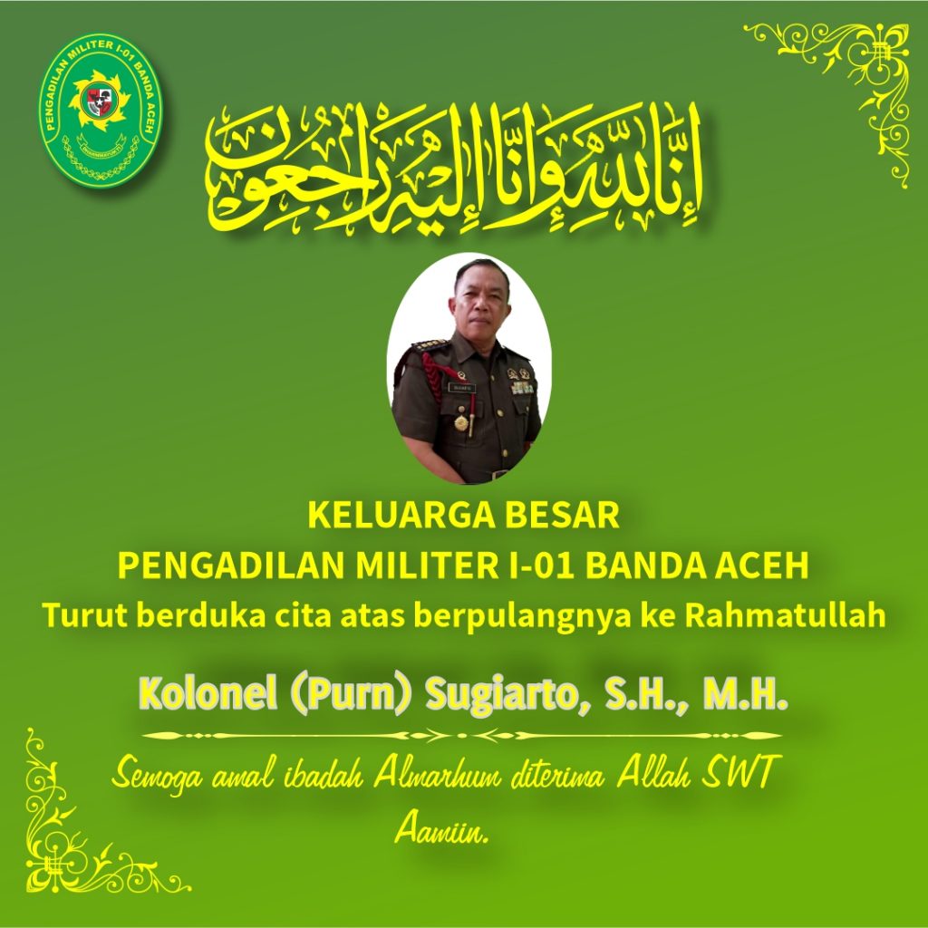 Innalillahi wa innailaihi rojiun.Turut berduka cita yang mendalam atas meninggalnya Kolonel (Purn) Sugiarto, S.H., M.H.Semoga amal ibadah beliau diterima di sisi Allah SWT serta keluarga yang ditinggalkan diberikan ketabahan dan keikhlasan. Aamiin