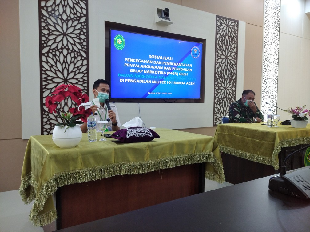 Banda Aceh, Kamis 20 Mei 2021. Bertempat di command center Pengadilan Militer I-01 Banda Aceh melaksanakan sosialisasi Pencegahan, Pemberantasan, Penyalahgunaan dan Peredaran Gelap Narkoba (P4GN) serta kegiatan pemeriksaan urine sesuai surat edaran no. 1719/SEK/OT.01.1/10/2020 tentang kegiatan tes urine dan sosialisasi P4GN. Kegiatan ini bekerjasama dengan Badan Narkotika Nasional Prov. Aceh.