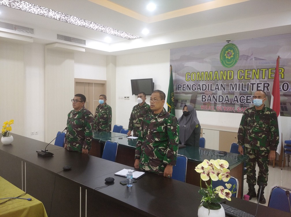 Banda Aceh – 2 Juni 2021. Bertempat di Ruang Command Center Pengadilan Militer I-01 Banda Aceh, Sekretaris dan Panitera Pengadilan Militer I-01 Banda Aceh beserta Panitera Pengganti dan Para Kasubbag mengikuti kegiatan Pembinaan dan Tindak Lanjut secara daring/virtual melalui Zoom Meeting Terhadap Hasil Temuan KPK, BPKP, dan BAWAS MARI di Lingkungan Peradilan Militer yang diselenggarakan oleh Ditjen Badilmiltun MARI.