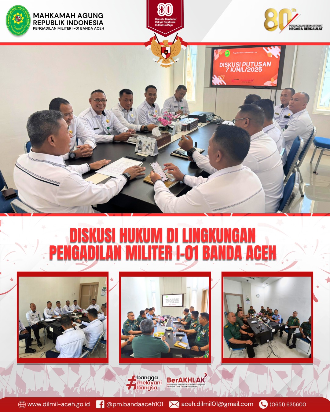 Banda Aceh – 6 Agustus 2025. Kepala Pengadilan Militer I-01 Banda Aceh bersama para Hakim, Panitera, dan Panitera Pengganti melaksanakan diskusi mendalam mengenai putusan Nomor 375 K/Mil/2024, terdakwa didakwa dengan dakwaan kumulatif yaitu Pertama Pasal 29 Juncto Pasal 4 Ayat (1) huruf d dan e Undang-Undang Nomor 44 Tahun 2008 tentang Pornografi dan Kedua Pasal 281 ke-1 KUHP, jika terdakwa di persidangan memberikan keterangan yang berbeda dengan keterangan yang ada di Berita Acara Pemeriksaan (BAP) hendaknya Majelis Hakim memerintahkan Oditur Militer untuk memanggil saksi verbal lisan agar dapat di cross check keterangan terdakwa di persidangan.