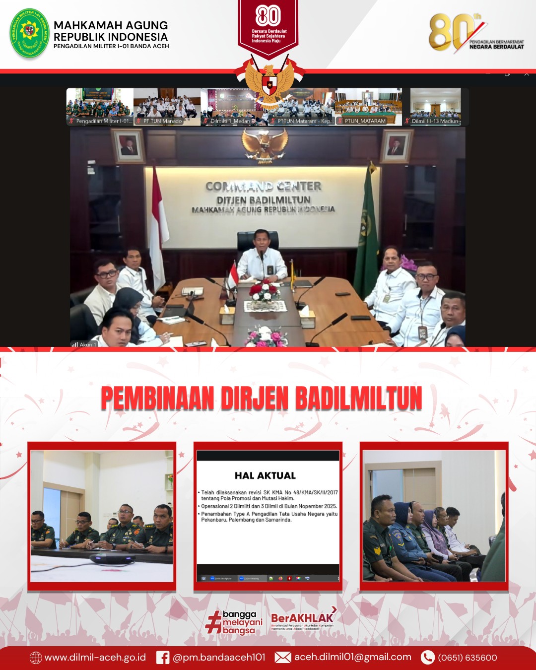 Pengadilan Militer I-01 Banda Aceh mengikuti kegiatan pembinaan yang disampaikan langsung oleh Direktur Jenderal Badan Peradilan Militer dan Peradilan Tata Usaha Negara (Badilmiltun) Mahkamah Agung RI, yang mengangkat tema penting dan relevan dengan tantangan aparatur peradilan masa kini.