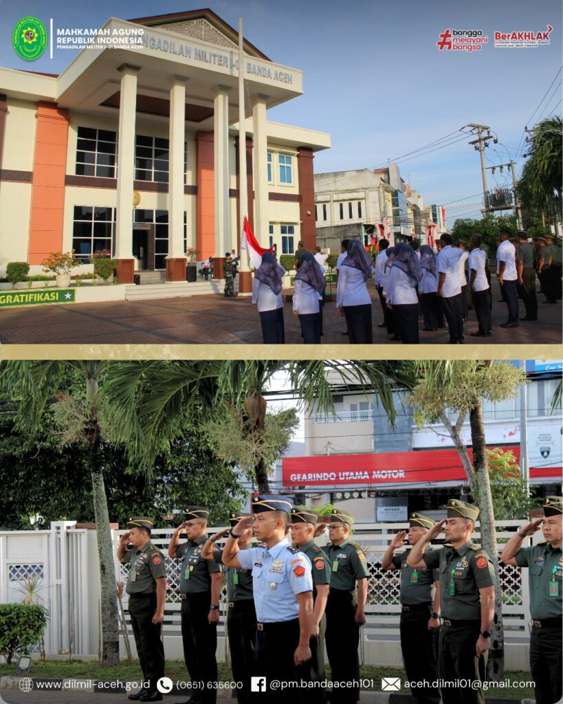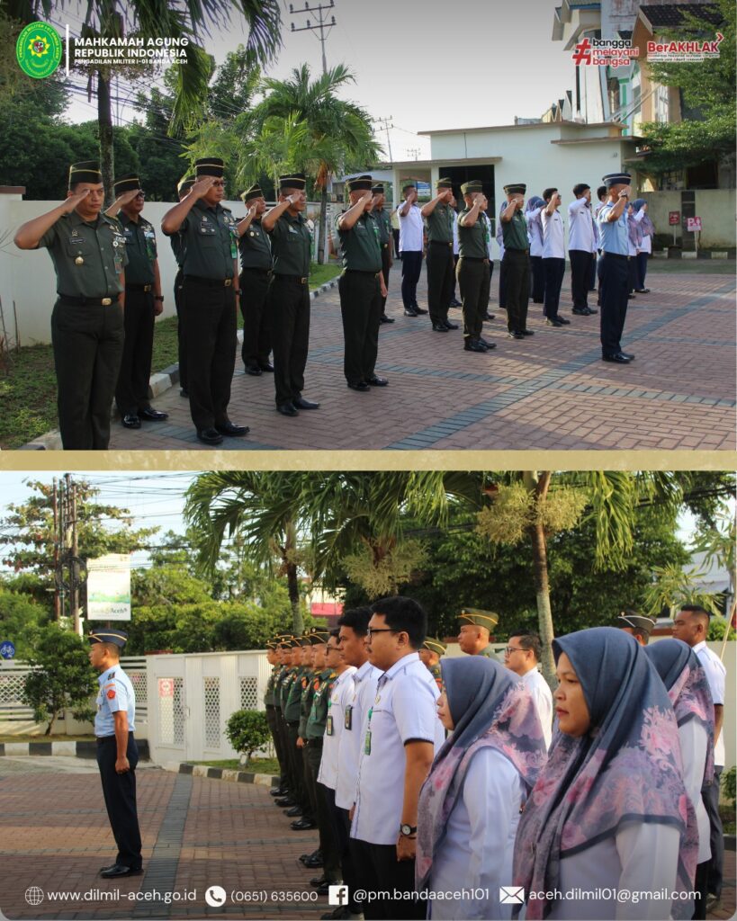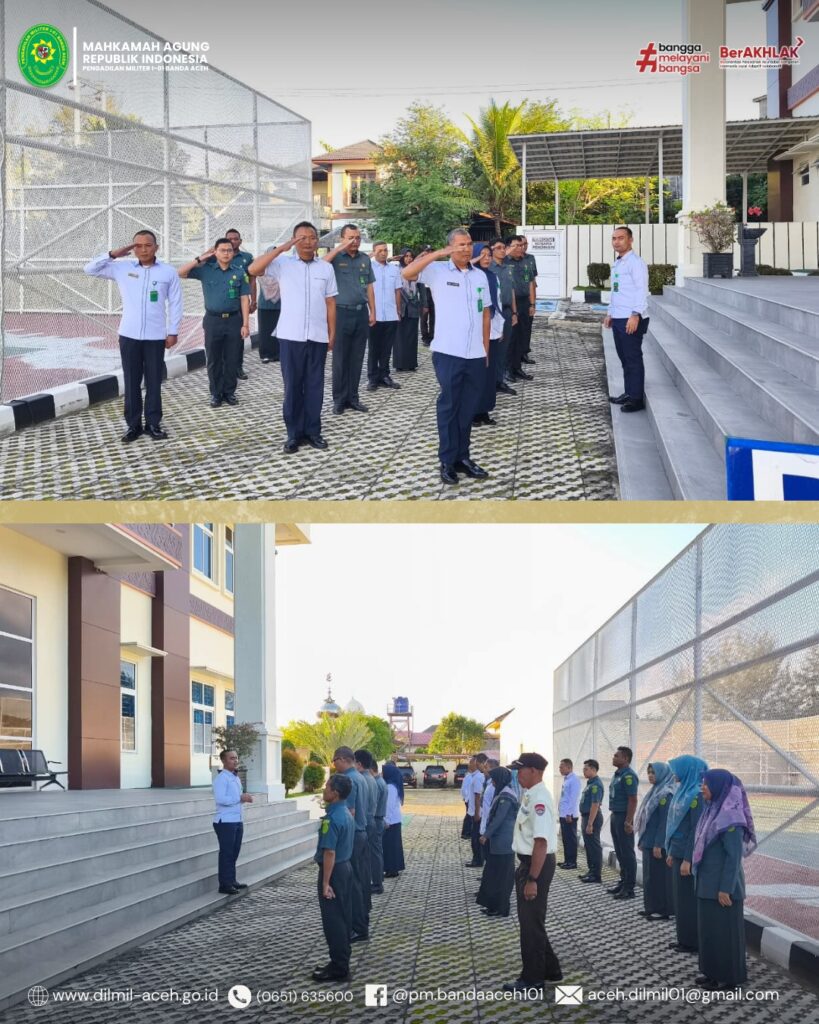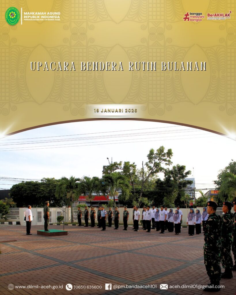 Banda Aceh, 19 Januari 2026. Pengadilan Militer I-01 Banda Aceh menyelenggarakan upacara bendera bulanan pada pagi hari dengan tertib dan penuh penghormatan. Upacara dipimpin oleh Kepala Pengadilan Militer I-01 Banda Aceh, Kolonel Chk Khamdan, S.Ag., S.H., M.H., dan diikuti seluruh personel Dilmil I-01 Banda Aceh. Kegiatan ini menjadi bagian dari pembinaan rutin untuk memperkuat sikap nasionalisme serta membangun kedisiplinan dalam pelaksanaan tugas sehari-hari.