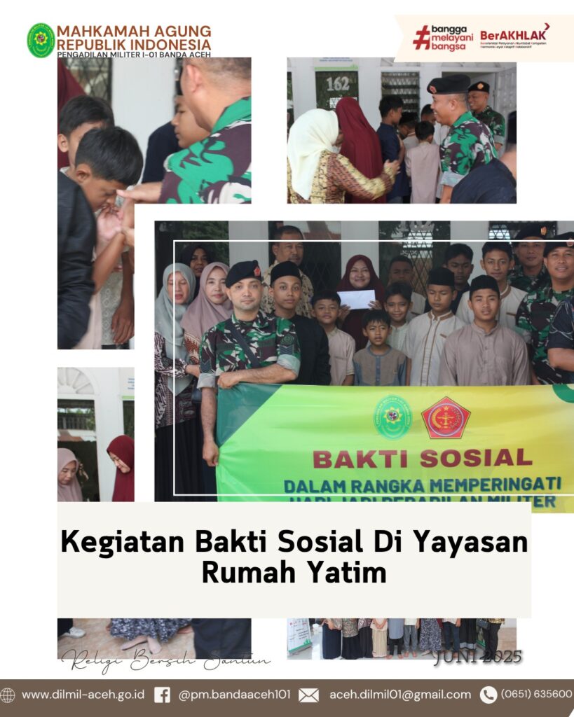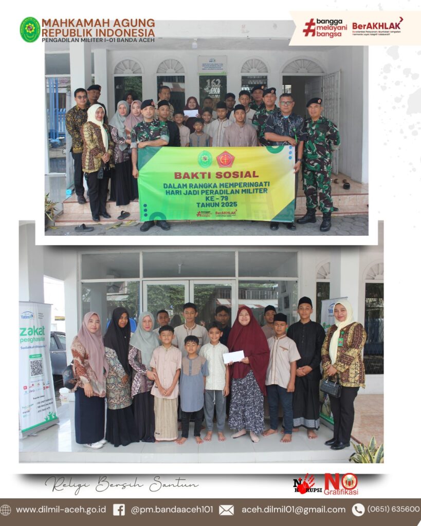 Dalam rangka memperingati Hari Ulang Tahun ke-79 Peradilan Militer (8 Juni 1946 – 8 Juni 2025), Pengadilan Militer I-01 Banda Aceh menggelar kegiatan bakti sosial di Yayasan Rumah Yatim, Gampong Lamlagang. Kegiatan ini merupakan wujud kepedulian dan rasa syukur keluarga besar Pengadilan Militer I-01 Banda Aceh atas bertambahnya usia lembaga peradilan militer di Indonesia. Melalui kegiatan ini, kami berharap dapat menumbuhkan semangat kebersamaan, berbagi, serta mempererat hubungan dengan masyarakat sekitar. “Kami ingin menjadikan momentum HUT ke-79 Peradilan Militer ini bukan hanya sebagai perayaan seremonial, tetapi juga sebagai bentuk nyata pengabdian dan empati kami terhadap sesama. Semoga kegiatan ini membawa manfaat dan memperkuat nilai-nilai kemanusiaan dalam setiap langkah pelayanan kami.” Semoga semangat pengabdian dan solidaritas terus menjadi landasan dalam menegakkan keadilan dan kemanusiaan.