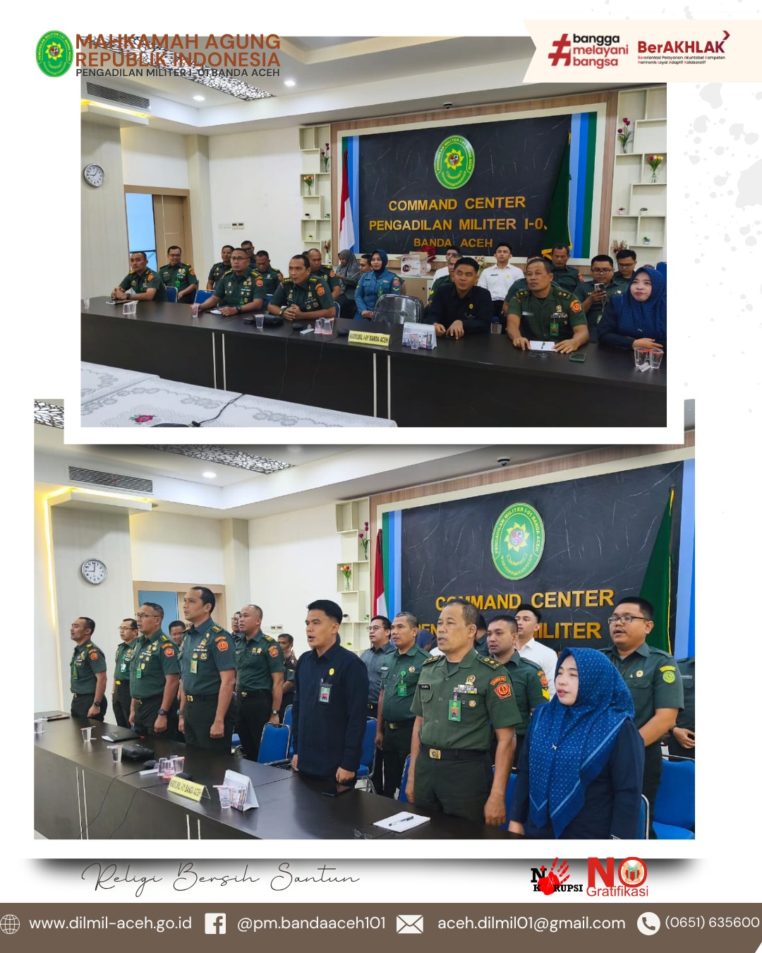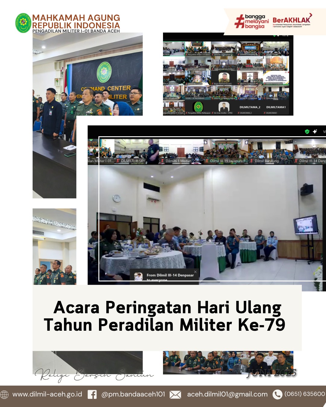 Banda Aceh – 10 Juni 2025. Seluruh personil mengikuti acara Peringatan Hari Ulang Tahun Peradilan Militer Ke 79 Tahun 2025 yang diselenggarakan oleh Pengadilan Militer Utama secara daring. “Peradilan Militer Tangguh, Indonesia Maju”