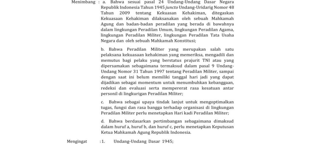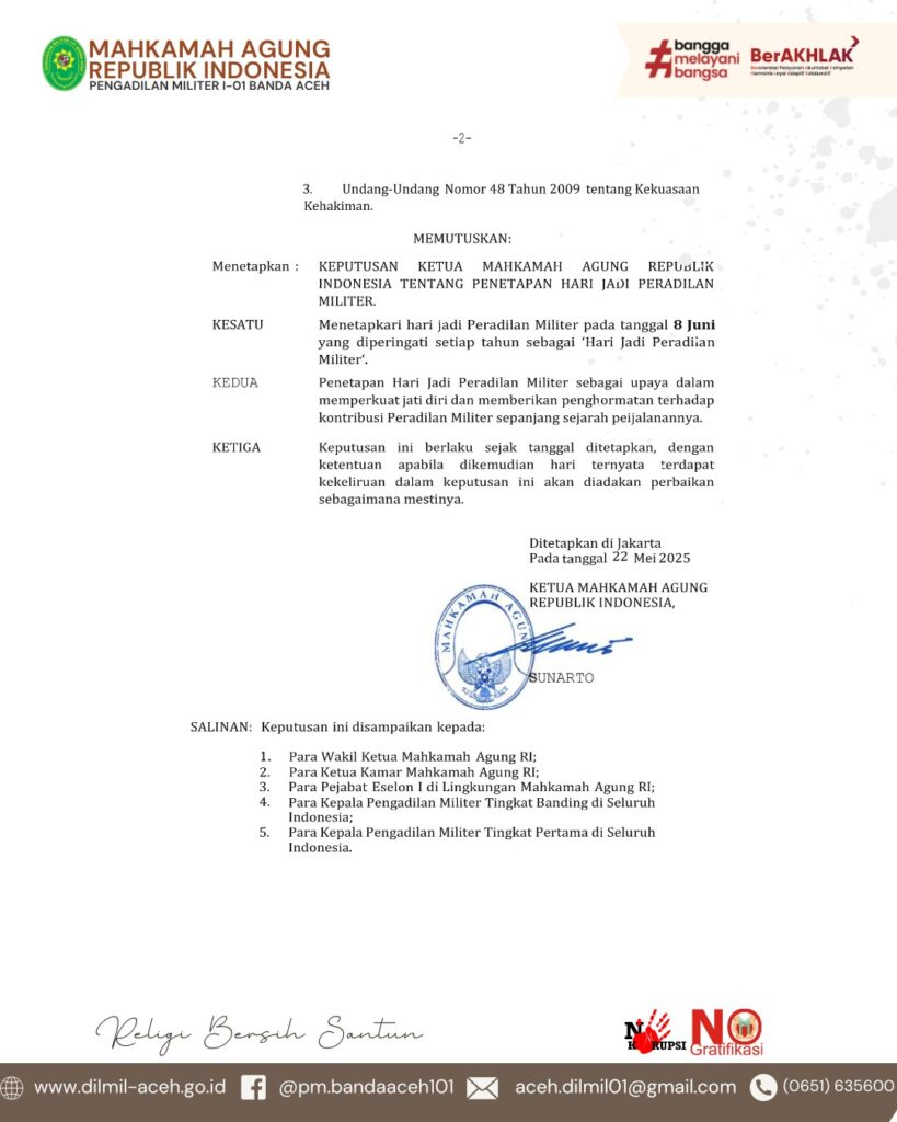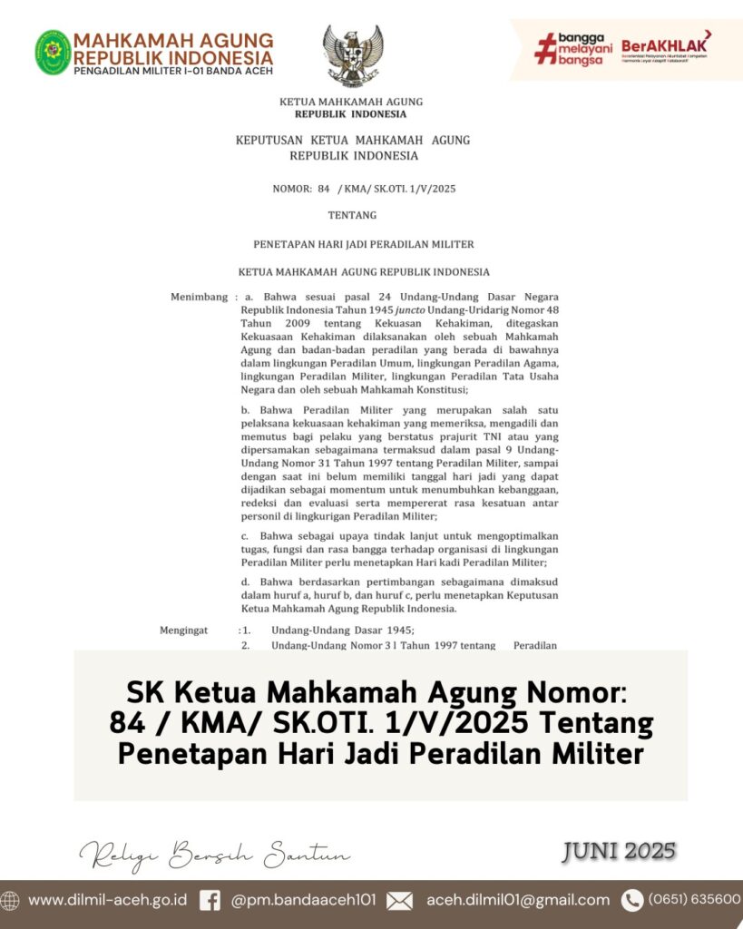 Setiap tanggal 8 Juni, kita memperingati Hari Jadi Peradilan Militer, sebagai momentum bersejarah lahirnya lembaga peradilan yang memiliki peran penting dalam menegakkan hukum dan disiplin di lingkungan TNI. Penetapan tanggal ini didasarkan pada tonggak berdirinya sistem peradilan militer di Indonesia, yang sejak awal kemerdekaan telah menjadi bagian integral dari penegakan hukum nasional. Mari jadikan peringatan ini sebagai momen refleksi untuk memperkuat komitmen terhadap integritas, profesionalisme, dan keadilan dalam menjalankan tugas sebagai aparat penegak hukum di lingkungan militer.