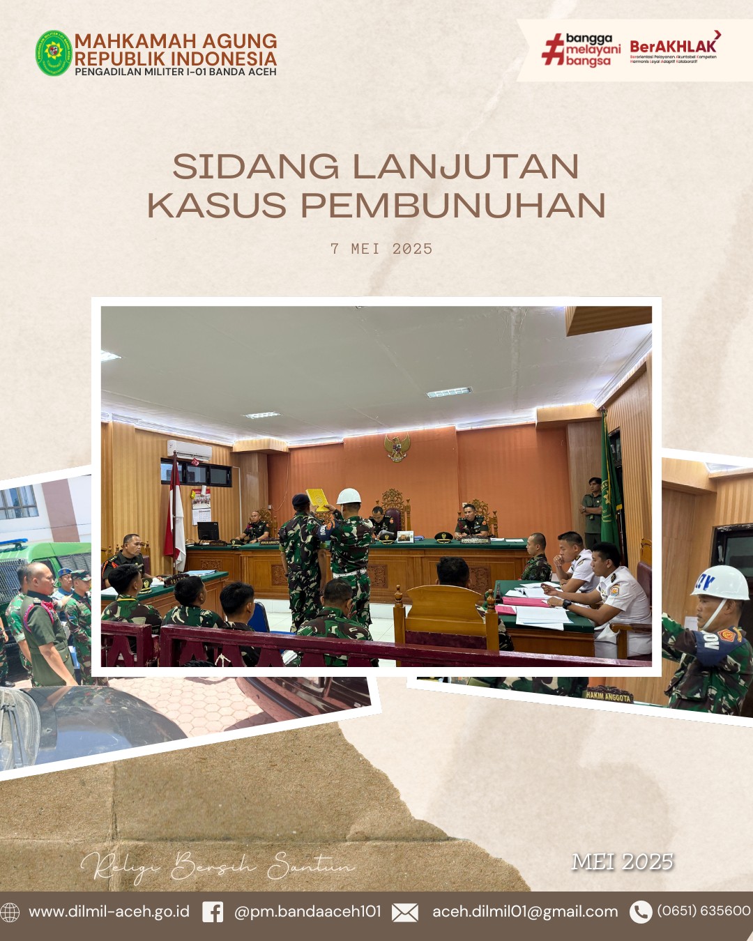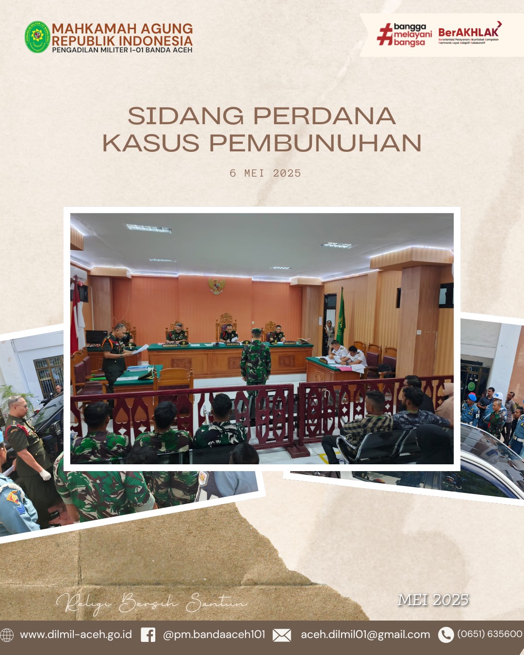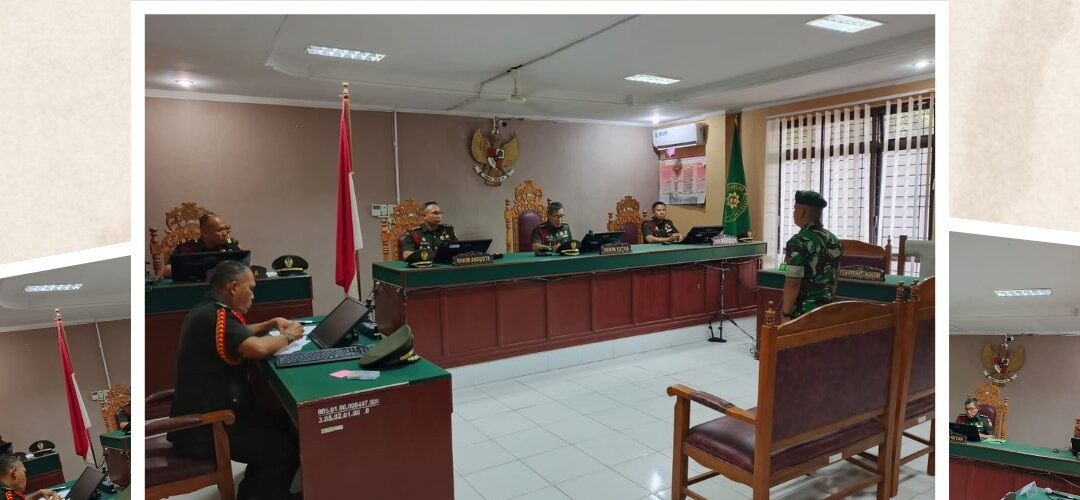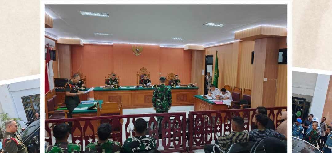 Lhokseumawe – 6 Mei 2025. Hari Kedua Pelaksanaan Sidang keliling Pengadilan Militer I-01 Banda Aceh bertempat di Ruang Sidang Garuda Pengadilan Negeri Lhokseumawe dilanjutkan dengan sidang perdana terdakwa Dede Irawan, anggota TNI AL Kelasi Dua Eta dalam perkara pembunuhan warga Aceh Utara, Hasfiani (37) dengan agenda pembacaan dakwaan oleh Oditur Militer, pemeriksaan para saksi dan pemeriksaan barang bukti.
