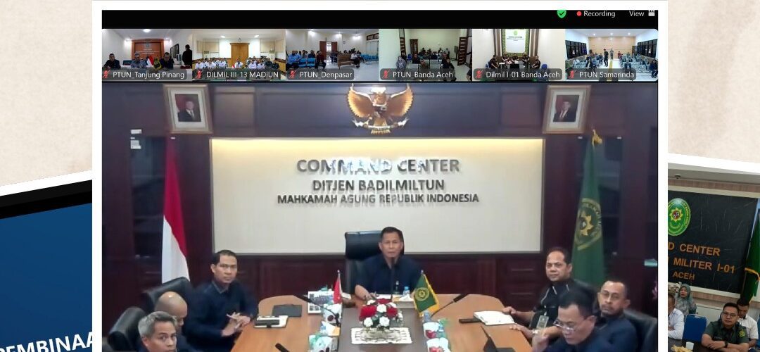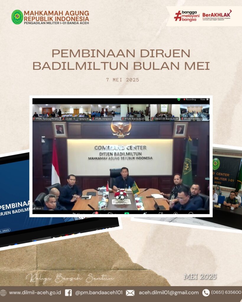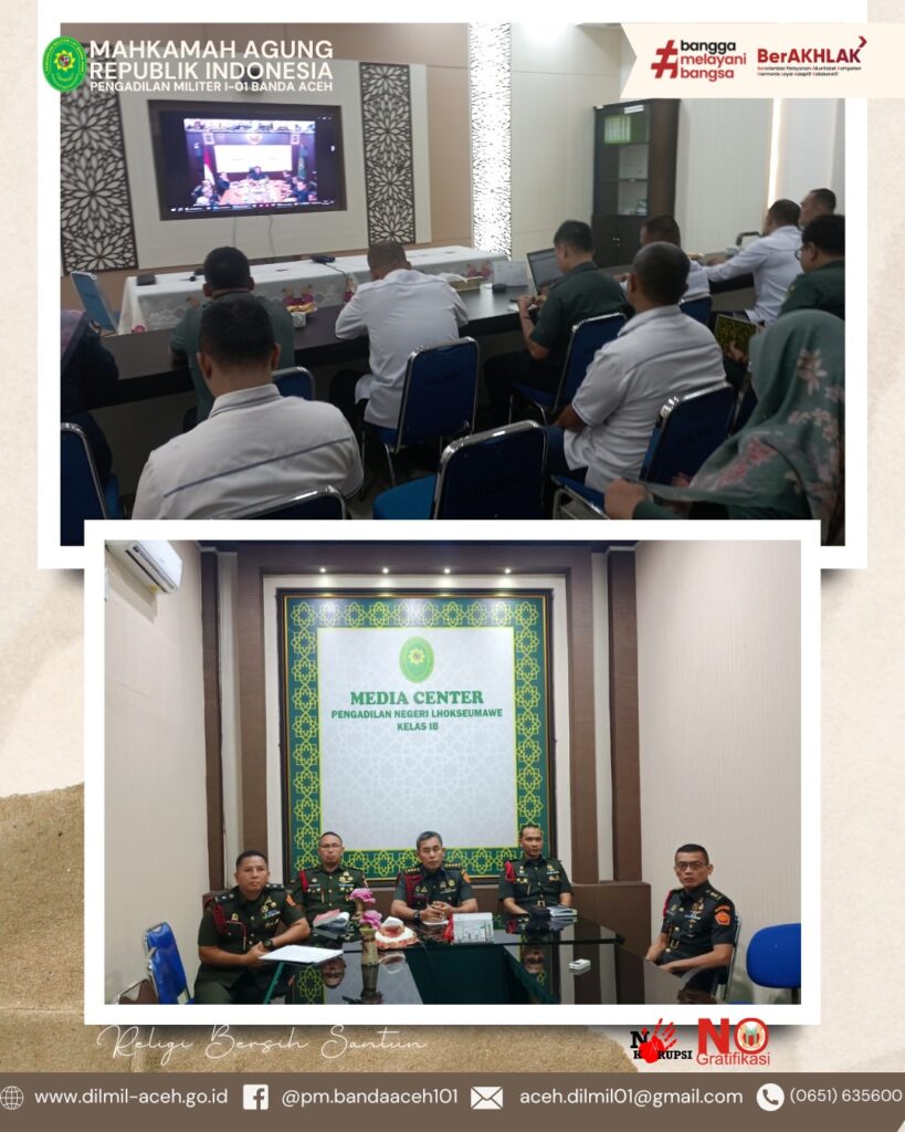 Banda Aceh – 7 Mei 2025. Personil Pengadilan Militer I-01 Banda Aceh & Para hakim yang berada di Lhokseumawe mengikuti Pembinaan yang dilaksanakan secara daring oleh Direktorat Jenderal Badan Peradilan Militer dan Badan Peradilan Tata Usaha Negara. Dalam Pembinaan tersebut Dirjen Badilmiltun menekankan untuk selalu menjaga integritas serta meningkatkan kedisiplinan bagi seluruh aparatur Peradilan.
