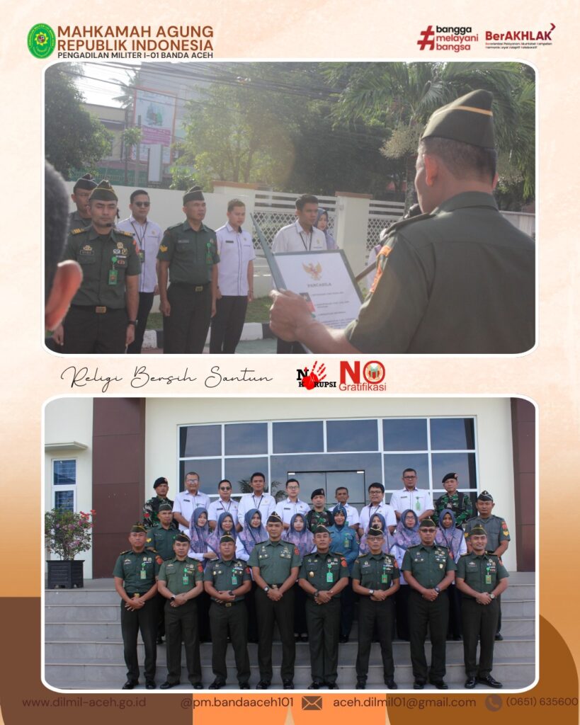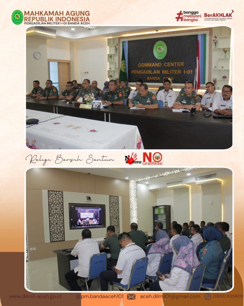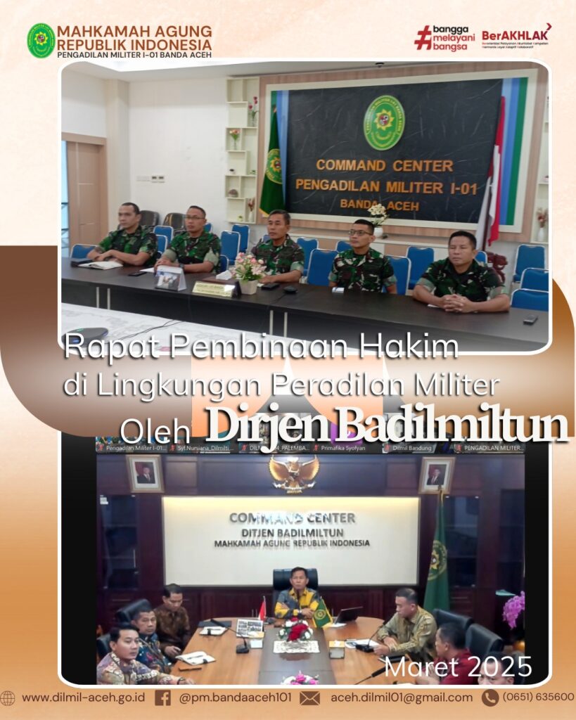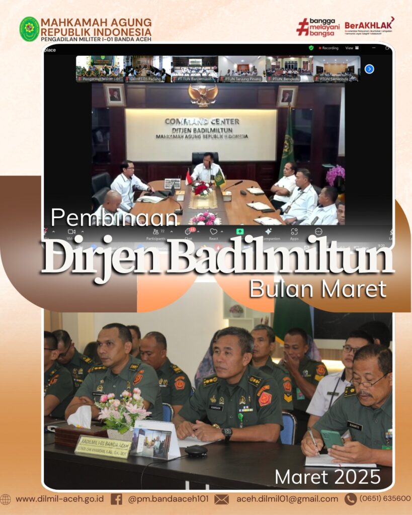 Banda Aceh – 3 Maret 2025, Kepala Pengadilan Militer I-01 Banda Aceh, Letkol Chk Khamdan, S.Ag., S.H., M.H. didampingi seluruh personil Pengadilan Militer I-01 Banda Aceh mengikuti Pembinaan yang dilaksanakan secara daring oleh Direktorat Jenderal Badan Peradilan Militer dan Badan Peradilan Tata Usaha Negara dan diikuti seluruh Pegawai satker yang berada di Lingkungan Peradilan Militer dan Peradilan Tata Usaha Negara.