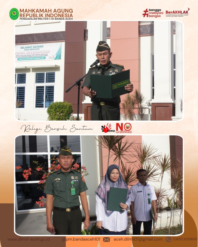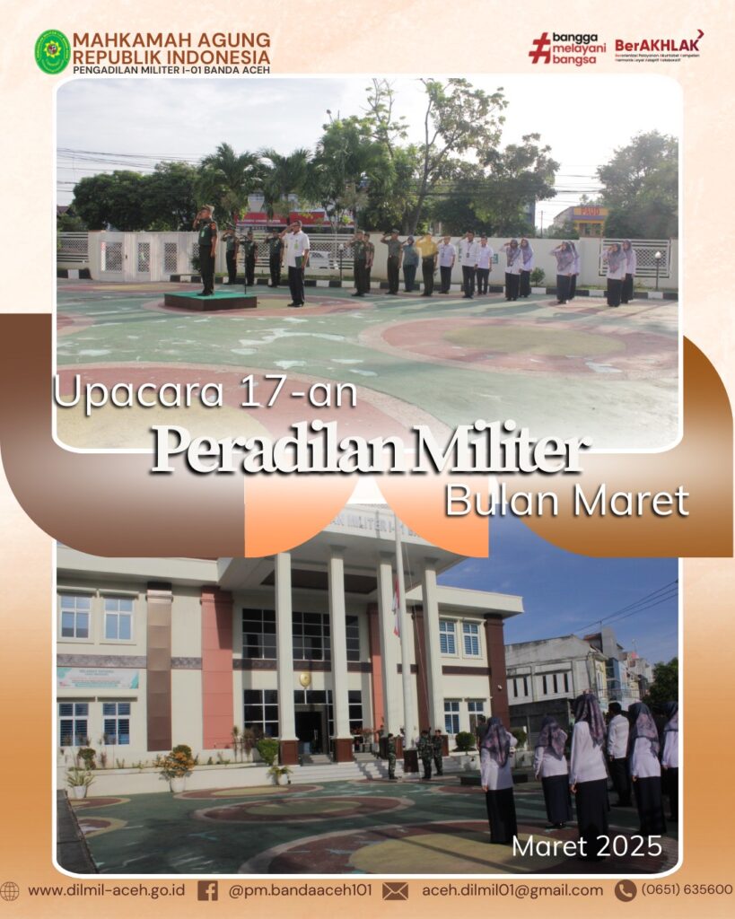 Banda Aceh – 17 Maret 2025. Pelaksanaan Upacara 17-an Peradilan Militer di Pengadilan Militer I-01 Banda Aceh yang diikuti oleh seluruh Personel dan Kepala Pengadilan Militer I-01 Banda Aceh, Letkol Chk Khamdan, S.Ag., S.H., M.H. bertindak sebagai Inspektur Upacara.
