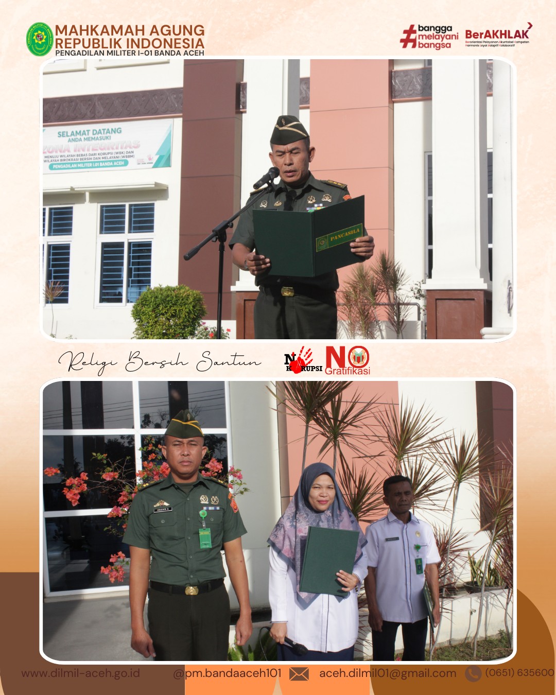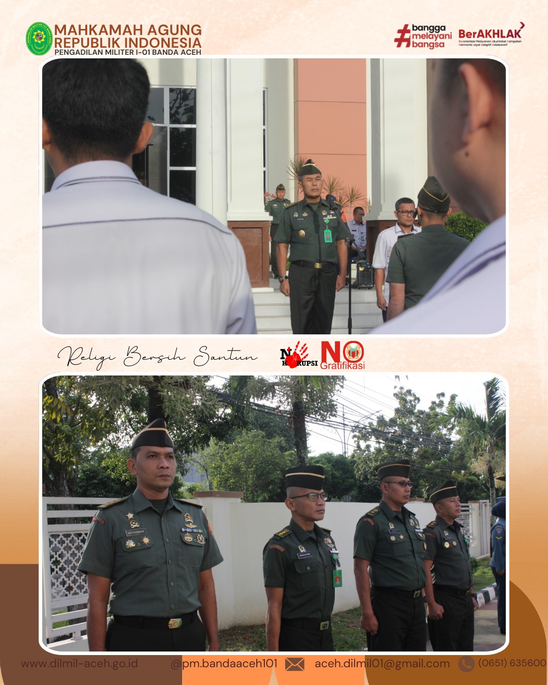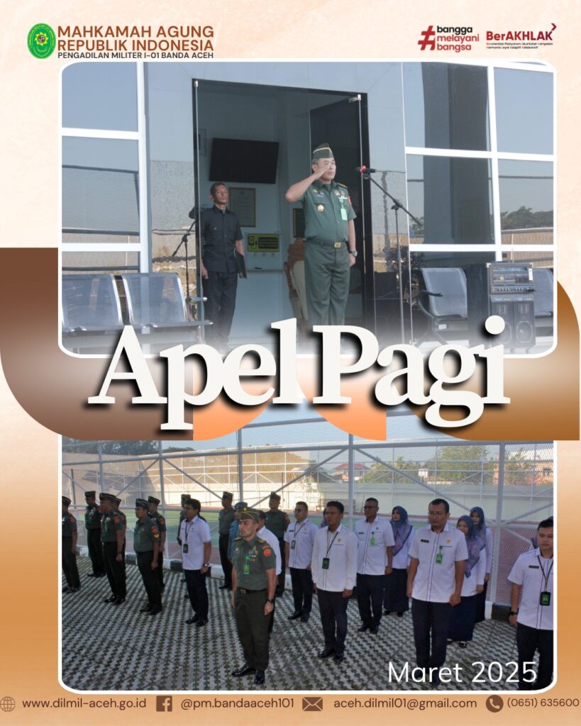 Banda Aceh – 3 Maret 2025. Pelaksanaan Kegiatan Apel Pagi yang dipimpin oleh Kepala Pengadilan Militer I-01 Banda Aceh, Letkol Chk Khamdan, S.Ag., S.H., M.H.. Dalam apel kepala menyampaikan untuk lebih meningkatkan iman dan ketakwaan pada bulan ramadan dikarenakan di bulan yang penuh berkah ini menjadi kesempatan bagi kita semua untuk meningkatkan ibadah sehingga amal ibadah kita diterima dan rahmat allah di limpahkan kepada kita semua. Selain itu, kadilmil juga menghimbau agar panitera, panmud untuk terus memonitor dalam pengisian SIPP.