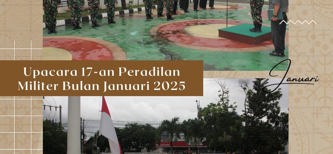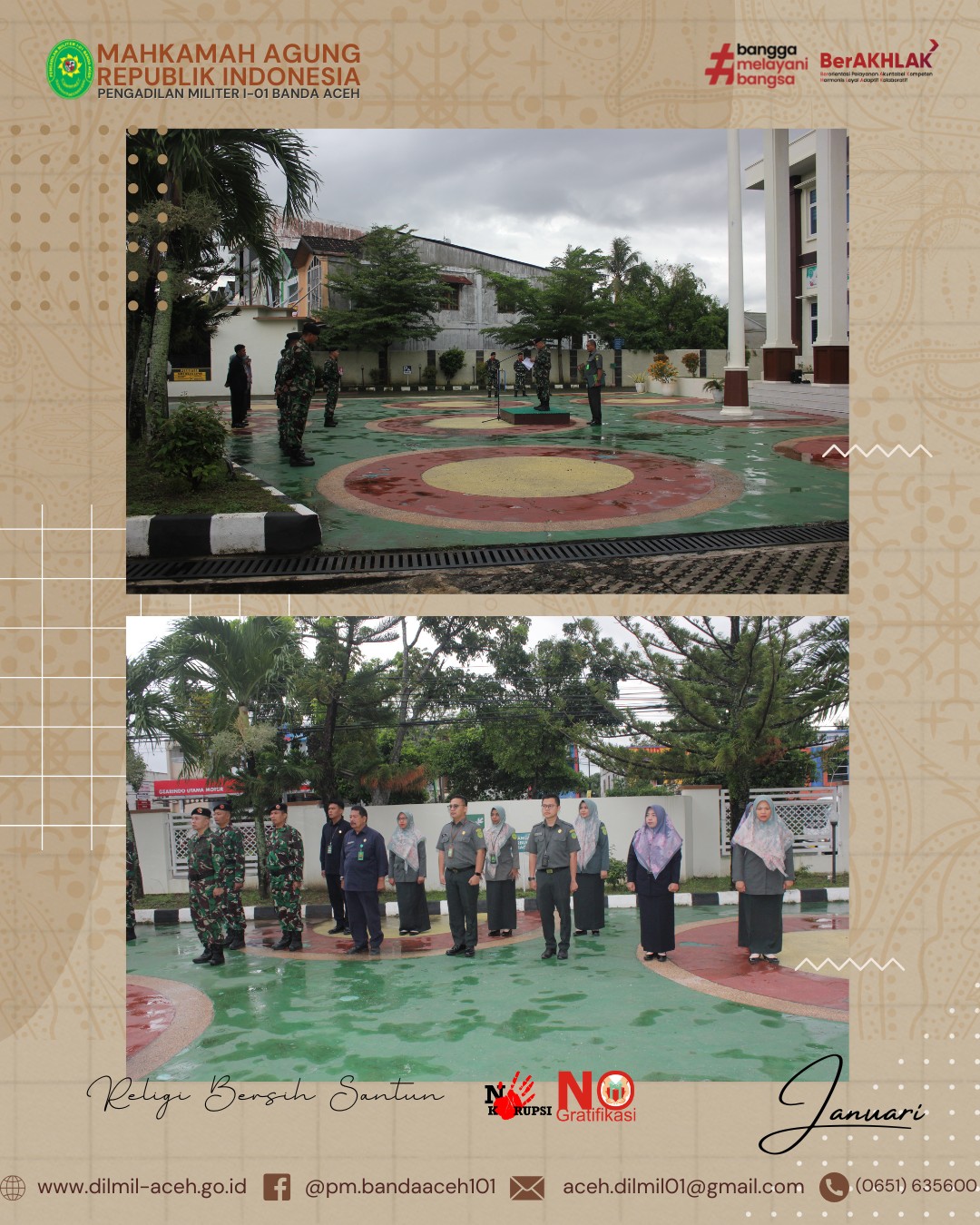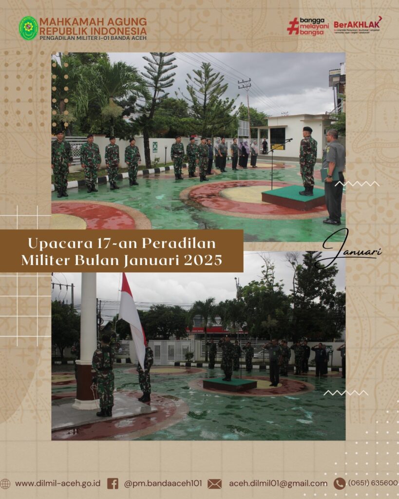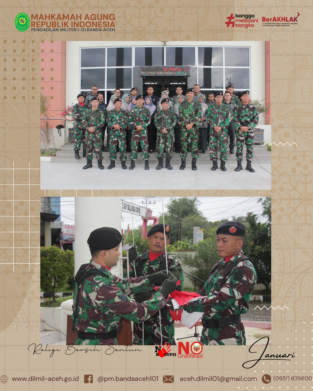 Banda Aceh – 17 Januari 2024. Pelaksanaan Upacara 17-an Peradilan Militer di Pengadilan Militer I-01 Banda Aceh yang diikuti oleh seluruh Personel. Kepala Pengadilan Militer I-01 Banda Aceh, Kolonel Kum M. Arif Zaki Ibrahim, S.H.. bertindak sebagai Inspektur Upacara.
