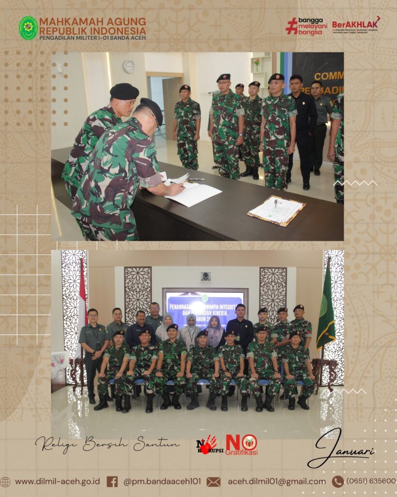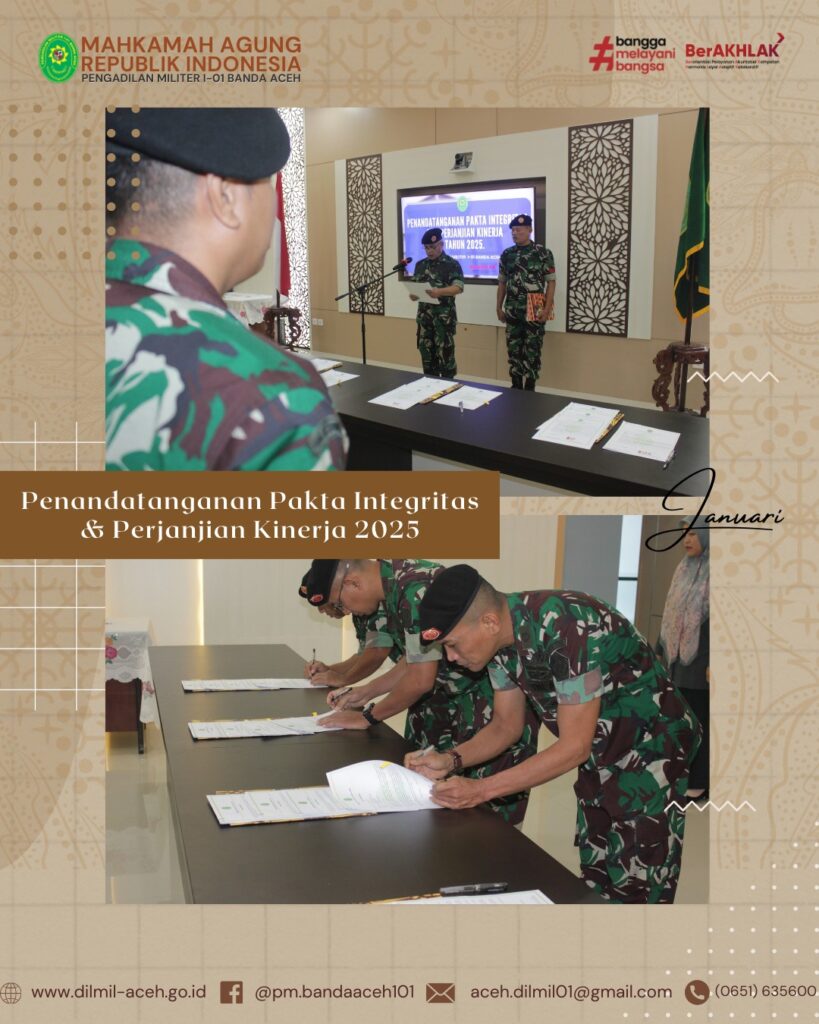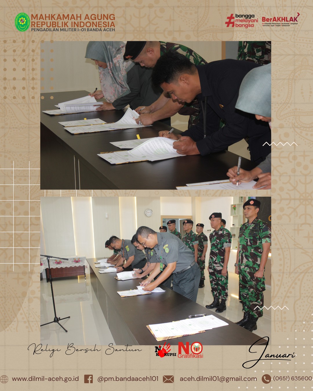 Banda Aceh – 17 Januari 2025. Pengadilan Militer I-01 Banda Aceh melaksanakan Penandatanganan Pakta Integritas dan Penandatanganan Perjanjian Kinerja (PK). Kegiatan ini dipimpin langsung Kepala Pengadilan Militer I-01 Banda Aceh, Kolonel Kum M. Arif Zaki Ibrahim, S.H. diikuti oleh Para Hakim, Panitera, Sekretaris dan seluruh Aparatur Sipil Negara (ASN) Dilmil I-01 Banda Aceh. Seluruh personil Pengadilan Militer I-01 Banda Aceh berkomitmen untuk bekerja sesuai dengan prinsip integritas tinggi. Pakta Integritas memuat janji-janji yang akan dipegang teguh oleh setiap individu di lingkungan pengadilan, termasuk kewajiban untuk berperan secara pro aktif dalam upaya pencegahan dan pemberantasan korupsi, kolusi dan nepotisme serta tidak melibatkan diri dalam perbuatan tercela. Setelah Penandatanganan Pakta Integritas dilaksanakan kegiatan penandatanganan perjanjian kinerja (PK) pegawai yang bertujuan untuk mewujudkan target kinerja serta tolak ukur kinerja pada tahun 2025.