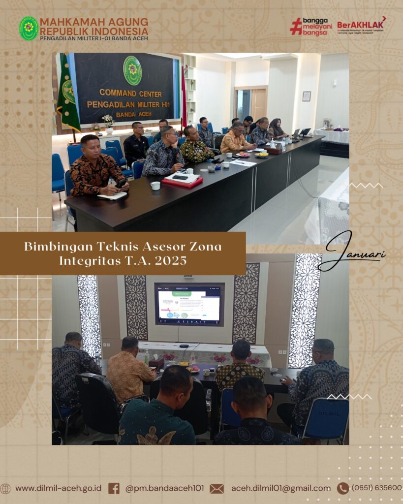 Banda Aceh – 21 Januari 2025. Kepala Pengadilan Militer I-01 Banda Aceh, Kolonel Kum M. Arif Zaki Ibrahim, S.H. beserta para Koordinator Area Zona Integritas dan Agen Perubahan Dilmil I-01 Banda Aceh mengikuti kegiatan Bimbingan Teknis Asesor Zona Integritas Tahun Anggaran 2025 yang diselenggarakan oleh Direktorat Jenderal Badan Peradilan Militer dan Peradilan Tata Usaha Negara Mahkamah Agung RI. Kegiatan ini dilaksanakan pada tanggal 20 s.d 22 Januari 2025.