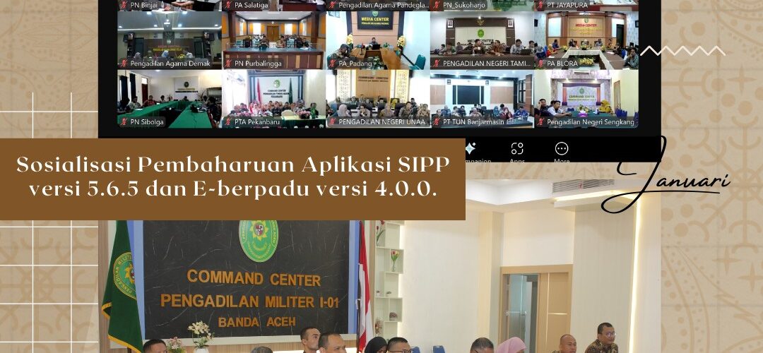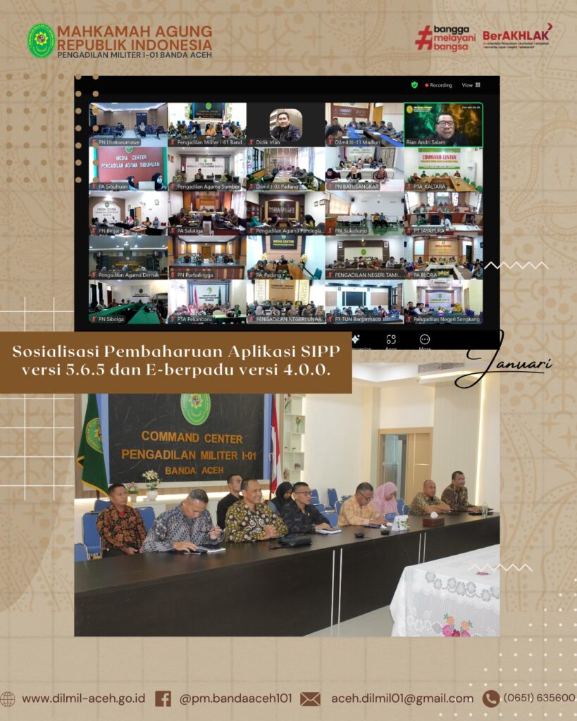 Banda Aceh – 23 Januari 2025. Kepala Pengadilan Militer I-01 Banda Aceh, Kolonel Kum M. Arif Zaki Ibrahim, S.H. bersama Hakim, Panitera, Panmud, PP dan Staf IT mengikuti Sosialisasi secara daring mengenai Pembaruan Aplikasi SIPP Tingkat Pertama versi 5.6.5, SIPP Tingkat Banding versi 5.0.0, dan Aplikasi e-BERPADU versi 4.0.0.