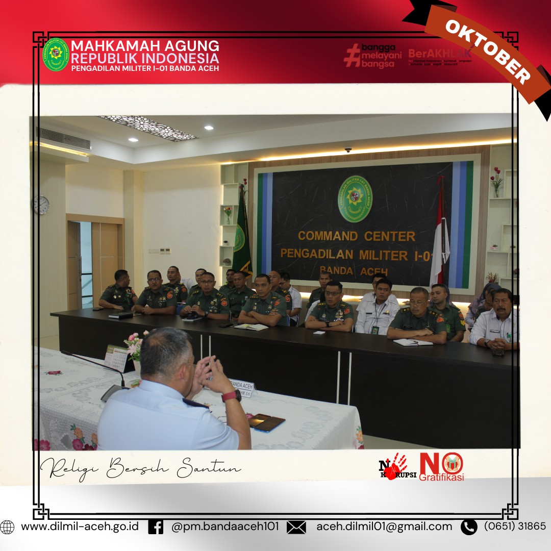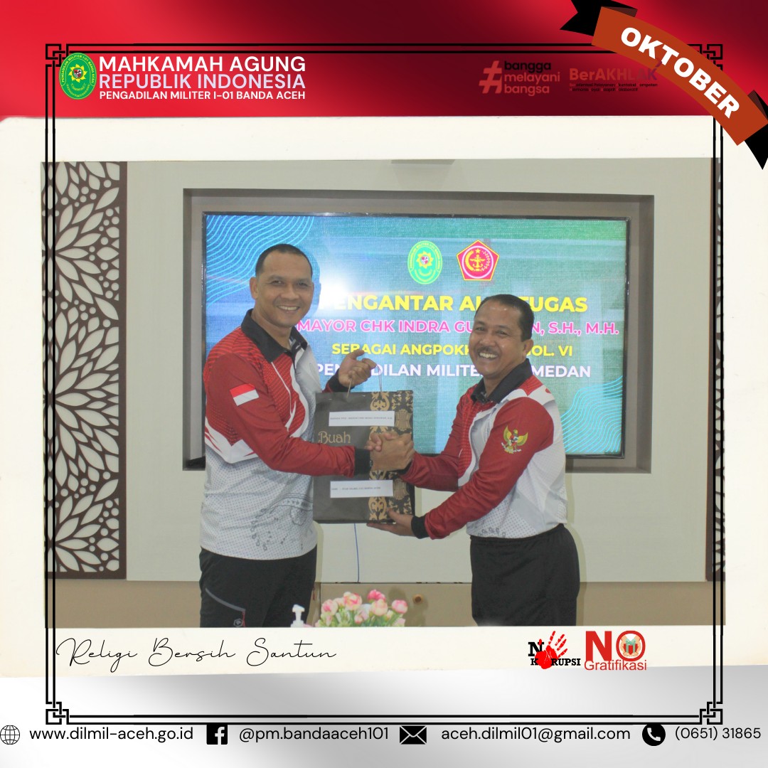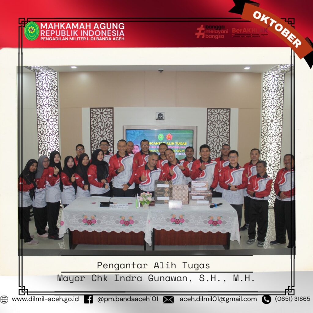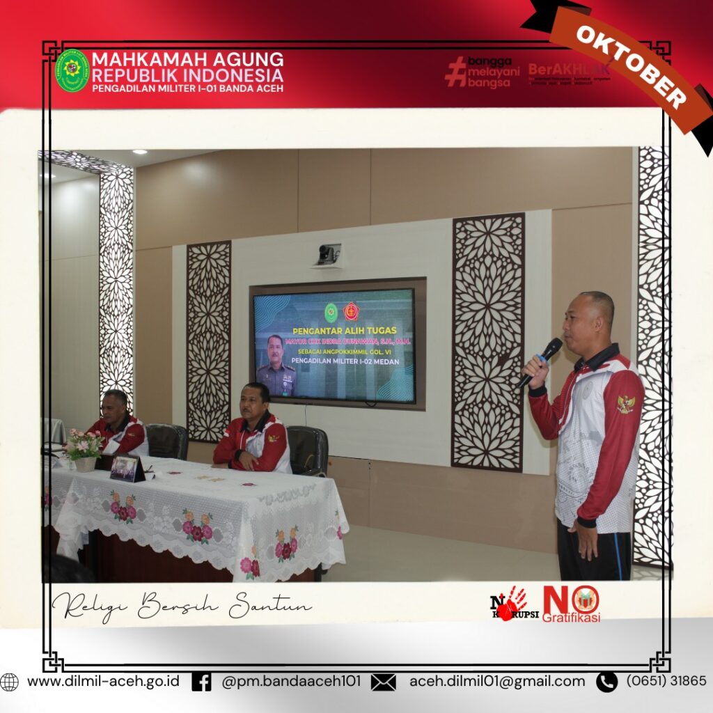 Banda Aceh – 25 Oktober 2024. Bertempat di Ruang Auditorium, Kepala Pengadilan Militer I-01 Banda Aceh Kolonel Kum M. Arif Zaki Ibrahim, S.H. beserta seluruh Personel melaksanakan acara perpisahan dan Pengantar Alih Tugas Angpokkimmil Mayor Chk Indra Gunawan S.H., M.H. yang akan pindah tugas ke Dilmil I-02 Medan.