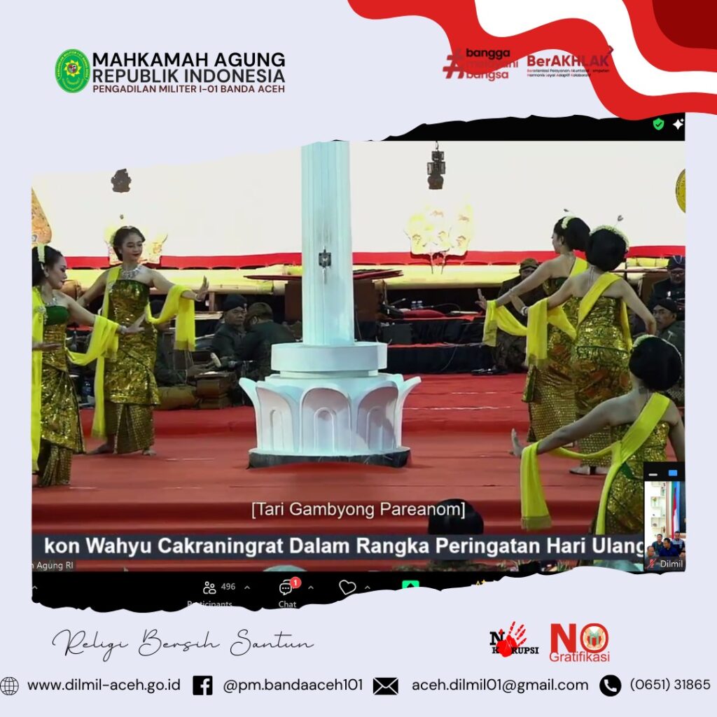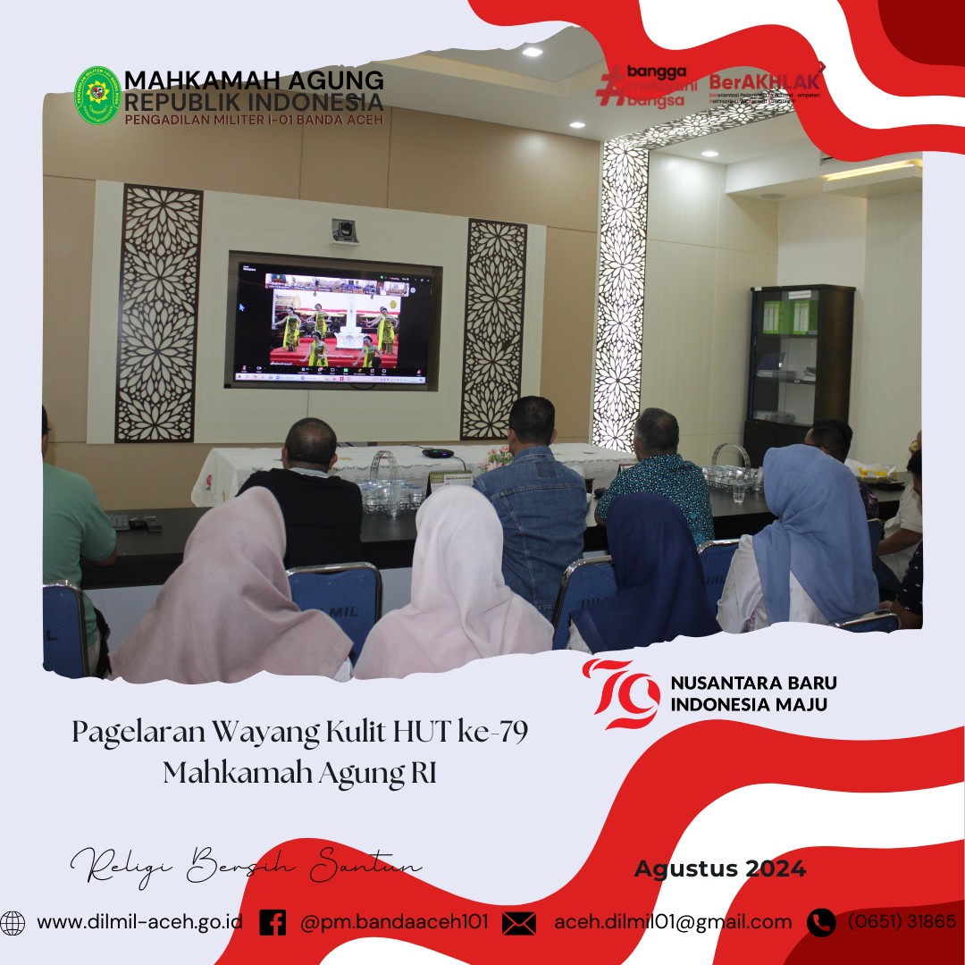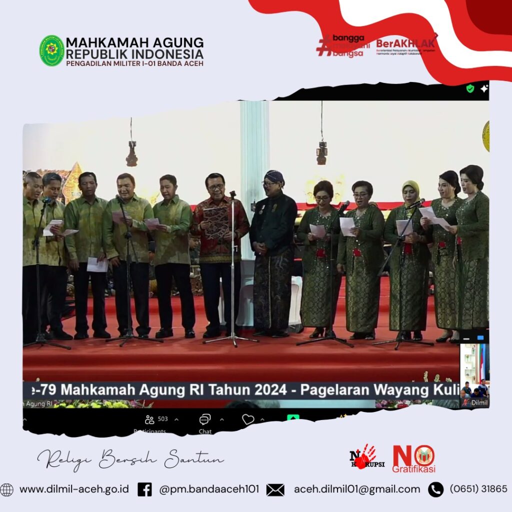 Banda Aceh – 31 Agustus 2024. Kepala Pengadilan Militer I-01 Banda Aceh, Kolonel Kum M. Arif Zaki Ibrahim, S.H. beserta personel mengikuti acara secara daring Pagelaran Wayang Kulit 1 Layar 3 Dalang dengan lakon “WAHYU CAKRANINGRAT” yang diselenggarakan oleh Mahkamah Agung RI dalam rangka memperingati HUT Mahkamah Agung RI ke 79 Tahun 2024.