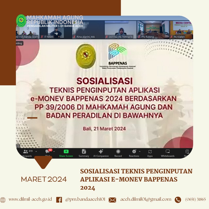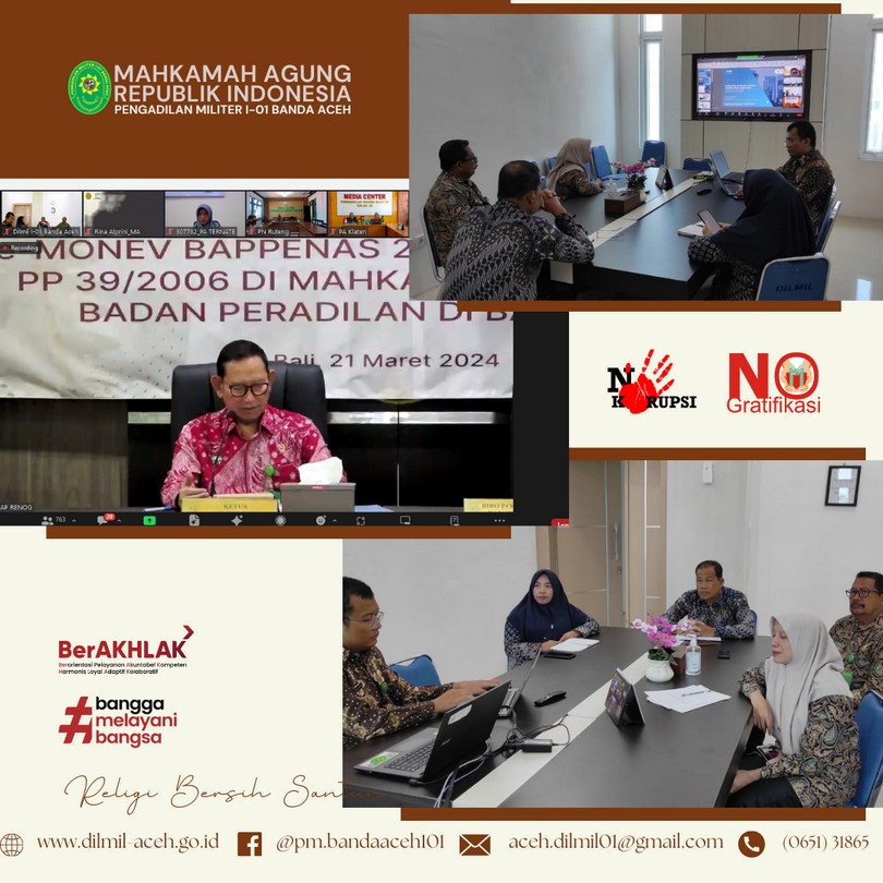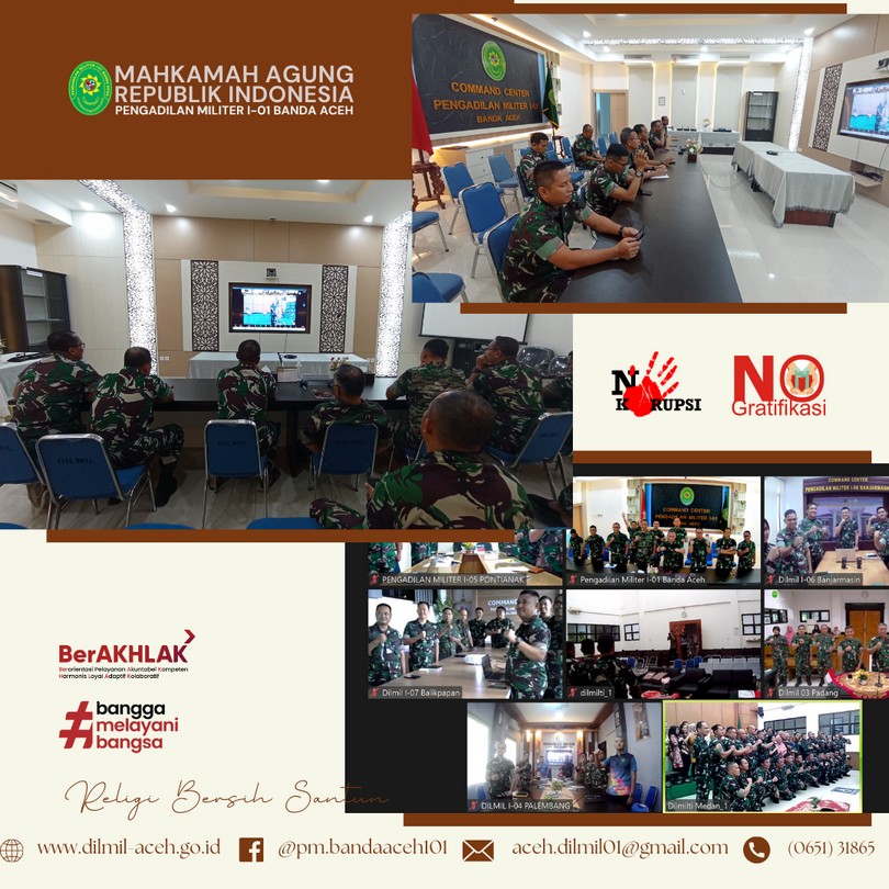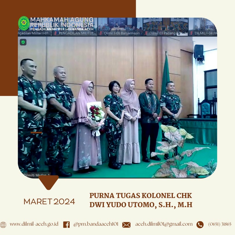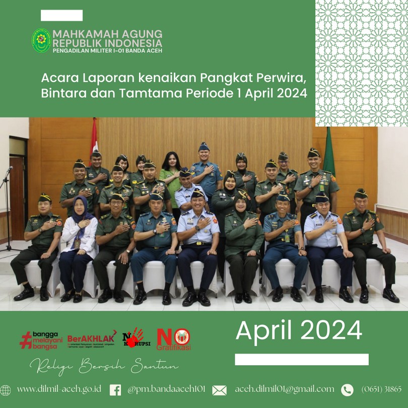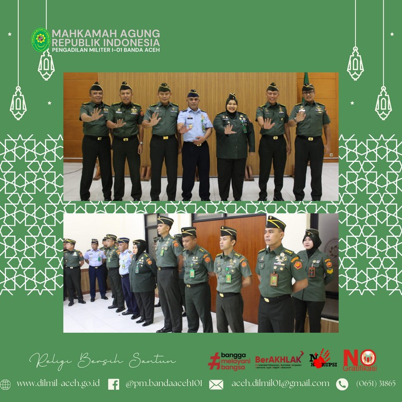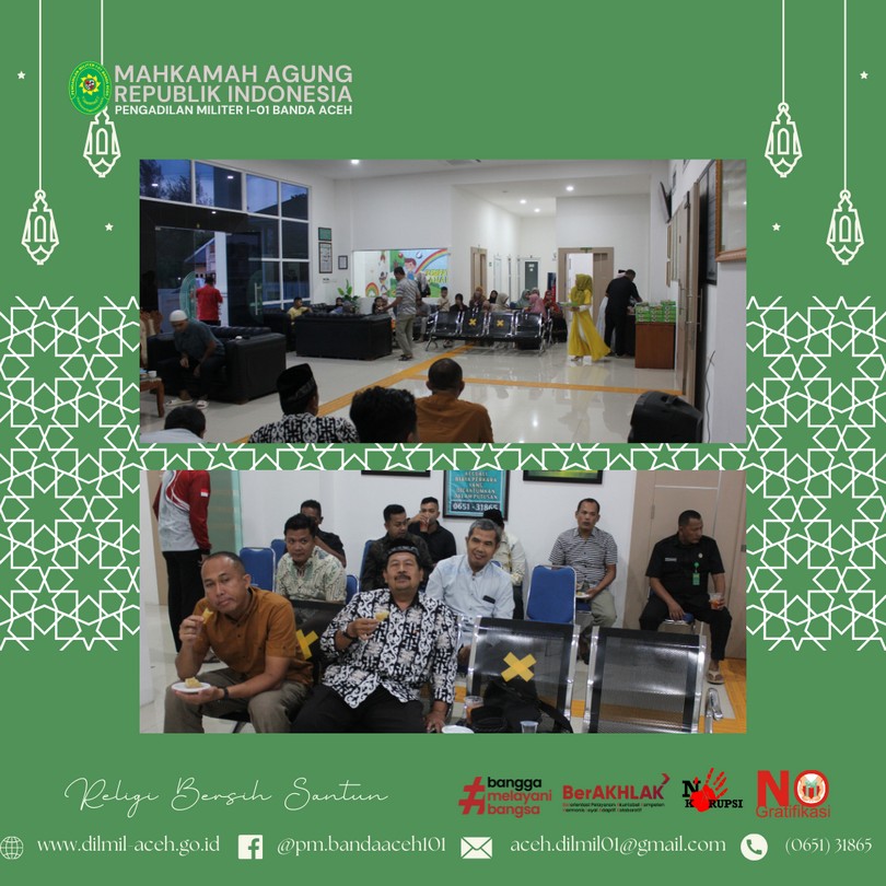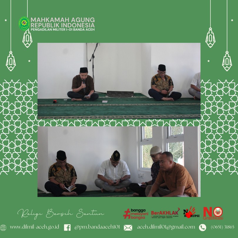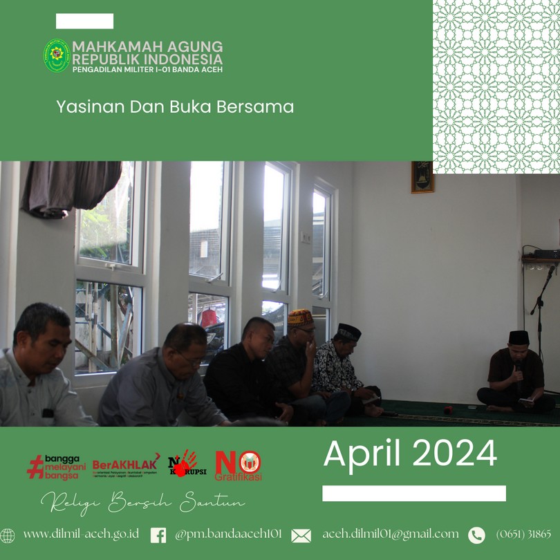 Banda Aceh, 4 April 2024 – Dilmil I-01 Banda Aceh melaksanakan kegiatan rutin Yasinan dilanjutkan acara buka puasa bersama sekaligus syukuran atas Kenaikan Pangkat Kepala Pengadilan, Kolonel Kum M. Arif Zaki Ibrahim, S.H., Hakim Militer Letkol Chk Arif Kusnandar, S.H. dan Panitera Pengadilan Mayor Chk Teddy Septiana, S.H.