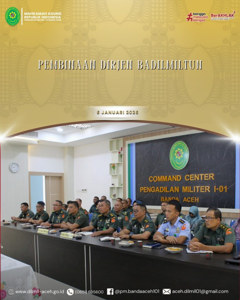 Banda Aceh – 6 Januari 2026. Direktur Jenderal Badan Peradilan Militer dan Peradilan Tata Usaha Negara Mahkamah Agung RI, Marsda TNI Dr. Yuwono Agung Nugroho. Kegiatan ini dihadiri oleh Kadilmil I-01 Banda Aceh Kolonel Chk Khamdan, S.Ag., S.H., M.H. serta Wakadilmil I-01 Banda Aceh Letkol Chk Arif Sudibya, S.H., M.H. serta seluruh personil. Dalam arahannya, Dirjen Badilmiltun meresmikan Aplikasi Pendukung SIPP (APS) Badilmiltun sebagai inovasi untuk mendukung Sistem Informasi Penelusuran Perkara. Aplikasi ini diharapkan dapat membantu meningkatkan ketepatan, kerapian administrasi, dan efektivitas pengelolaan perkara di lingkungan peradilan militer dan peradilan tata usaha negara. Selain itu, disampaikan pula pentingnya refleksi dan evaluasi kinerja di awal tahun sebagai bahan menilai capaian, melihat kendala yang ada, serta memperbaiki pelaksanaan tugas ke depan, khususnya dalam mendukung proses peradilan dan peningkatan pelayanan kepada masyarakat.