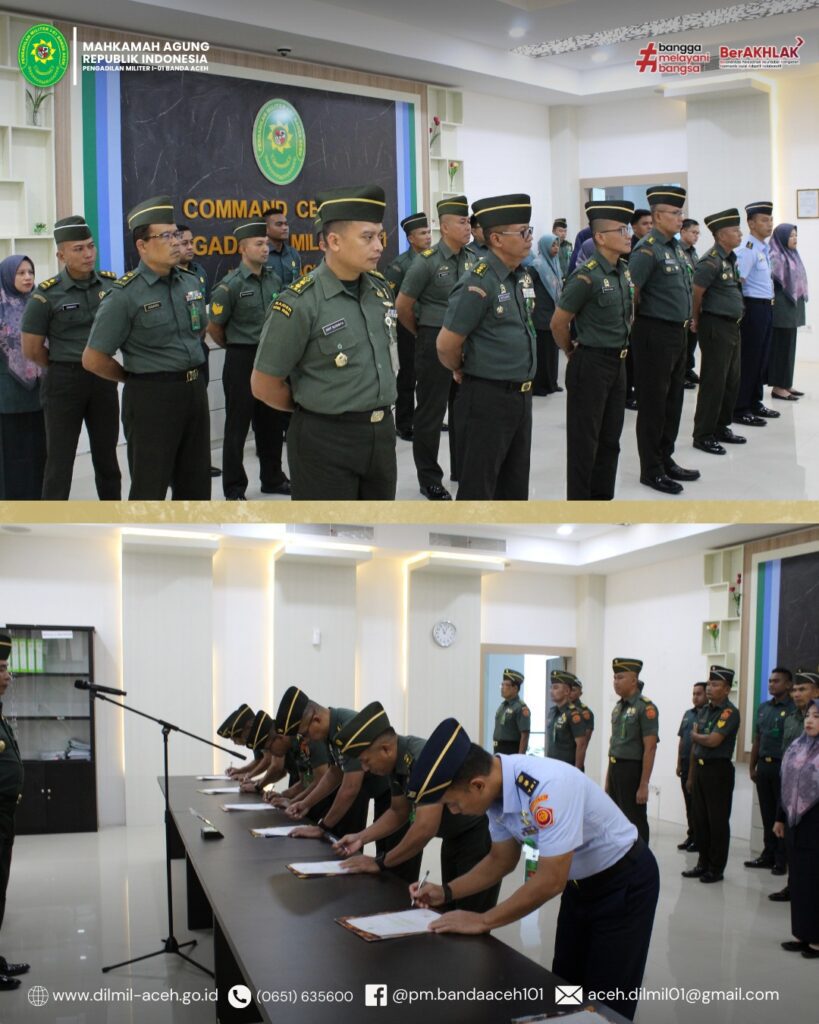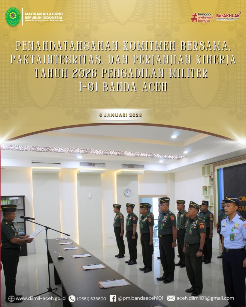 Banda Aceh – 6 Januari 2026. Bertempat di Ruang Auditorium, Pengadilan Militer I-01 Banda Aceh melaksanakan Penandatanganan Komitmen Bersama, Pakta Integritas, dan Perjanjian Kinerja Tahun 2026 yang dipimpin oleh Kadilmil I-01 Banda Aceh Kolonel Chk Khamdan, S.Ag., S.H., M.H. Kegiatan ini menjadi langkah awal untuk menyatukan komitmen seluruh aparatur dalam menjalankan tugas secara profesional, transparan, dan bertanggung jawab, sekaligus mendorong peningkatan kinerja dan penguatan integritas dalam penyelenggaraan peradilan.