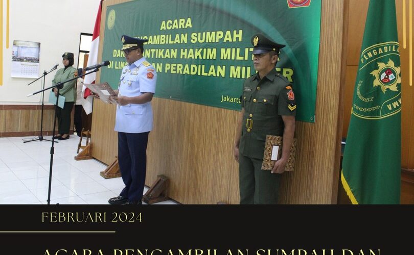 Jakarta – 5 Februari 2024. Kepala Pengadilan Militer Utama Marsda TNI Haryo Kusworo, S.H., M.Hum. memimpin Acara Pengambilan Sumpah dan Pelantikan Hakim Militer di Lingkungan Peradilan Militer yang dilaksanakan di Ruang Sidang Pengadilan Militer Utama.