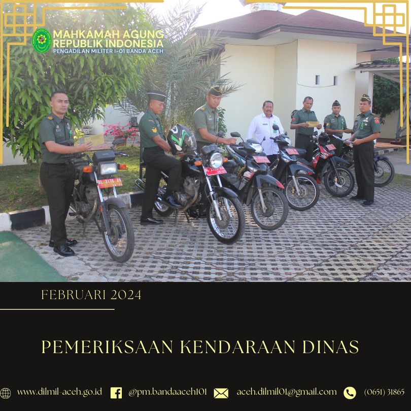 Banda Aceh – 6 Februari 2024. Pengadilan Militer I-01 Banda Aceh menggelar pemeriksaan dan pengecekan terhadap kendaraan operasional roda dua maupun roda empat yang merupakan BMN (Barang Milik Negara) yang dimiliki Pengadilan Militer I-01 Banda Aceh.