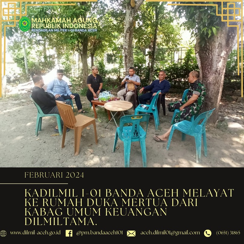 Banda Aceh – 3 Februari 2024. Kepala Pengadilan Militer I-01 Banda Aceh, Letkol Kum M. Arif Zaki Ibrahim, S.H. bertakziah atas meninggalnya Bapak M. Hasan bin Saad, mertua dari Kolonek Chk Endang Sumiarto, S.H., M.H. (Kabag Umum dan Keuangan Pengadilan Militer Utama) pada sabtu, 3 Februari 2024 di rumah duka yang berada di Desa Tanjung Selamat Kec. Darussalam Lorong Ujong, Aceh Besar.