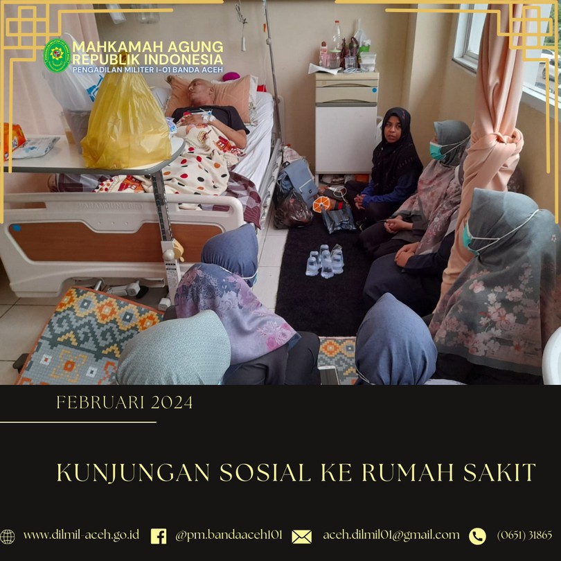 Banda Aceh – 6 Februari 2024. Ibu – ibu Dharmayukti Pengadilan Militer I-01 Banda Aceh melakukan kunjungan sosial untuk menjenguk Suami dari ASN Hasra Monita yang sedang dirawat di Rumah Sakit Umum Zainal Abidin Banda Aceh.