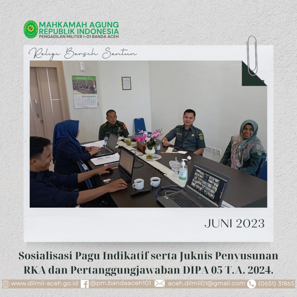 Banda Aceh – 13 Juni 2023. Sekretaris, Kasubbag PTIP , Kasubbag Kepegawaian dan staf kepaniteraan Dilmil I-01 Banda Aceh mengikuti kegiatan Sosialisasi Pagu Indikatif Serta Petunjuk Teknis Penyusunan Rencana Kerja Anggaran (RKA) Dan Pertanggungjawaban DIPA 05 Tahun 2024 yang diselenggarakan oleh Dirjen Badilmiltun secara daring.