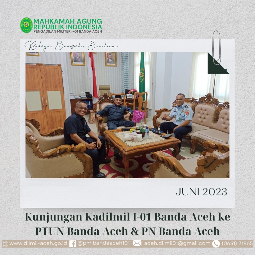 Banda Aceh – 13 Juni 2023. Kepala Pengadilan Militer I-01 Banda Aceh, Letkol Sus M. Arif Zaki Ibrahim, S.H., melakukan Kunjungan ke Pengadilan Tata Usaha Negara Banda Aceh dan Pengadilan Negeri Banda Aceh. Dalam kunjungan tersebut Kadilmil I-01 Banda Aceh disambut hangat oleh ketua PTUN Banda Aceh, bapak H. Mochamad Arief Pratomo, S.H., M.H. dan ketua Pengadilan Negeri Banda Aceh, bapak R. Hendral, S.H., M.H.