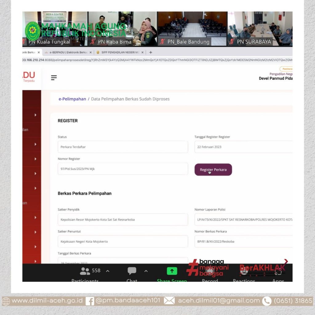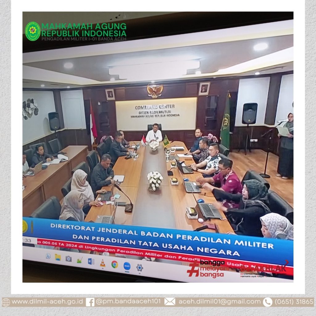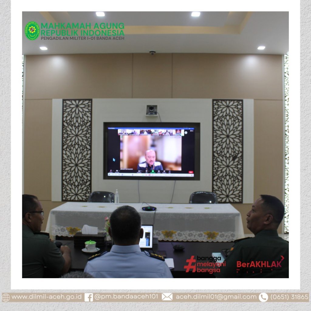 Banda Aceh – 12 Juni 2023, Sekretaris Dilmil I-01 Banda Aceh, Mayor Chk Sukarto, S.H. dan Kepala Sub Bagian PTIP Dilmil I-01 Banda Aceh Iin Subandia, S.E., mengikuti Kegiatan Penyusunan dan Pendampingan RKA-K/L Pagu Indikatif Tahun Anggaran 2024 Mahkamah Agung dan Badan Peradilan di Bawahnya yang diselenggarakan oleh Biro Perencanaan dan Organisasi, Badan Urusan Administrasi Mahkamah Agung RI secara Daring.