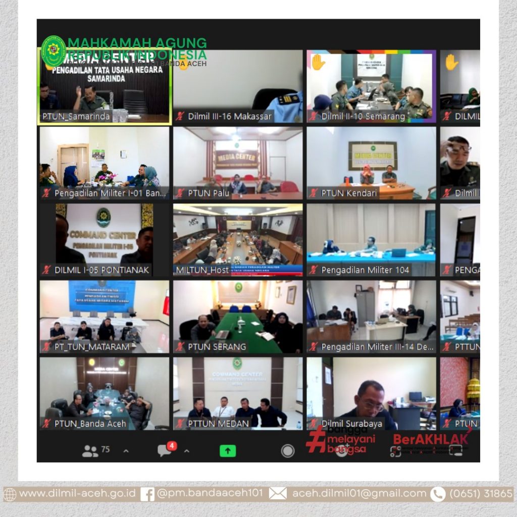 Banda Aceh – 14 Juni 2023. Kepala Pengadilan Militer I-01 Banda Aceh, Letkol Sus M. Arif Zaki Ibrahim, S.H. bersama para hakim, panitera dan panitera pengganti mengikuti kegiatan sosialisasi pembaharuan aplikasi e-Berpadu versi 3.0.0 secara daring.