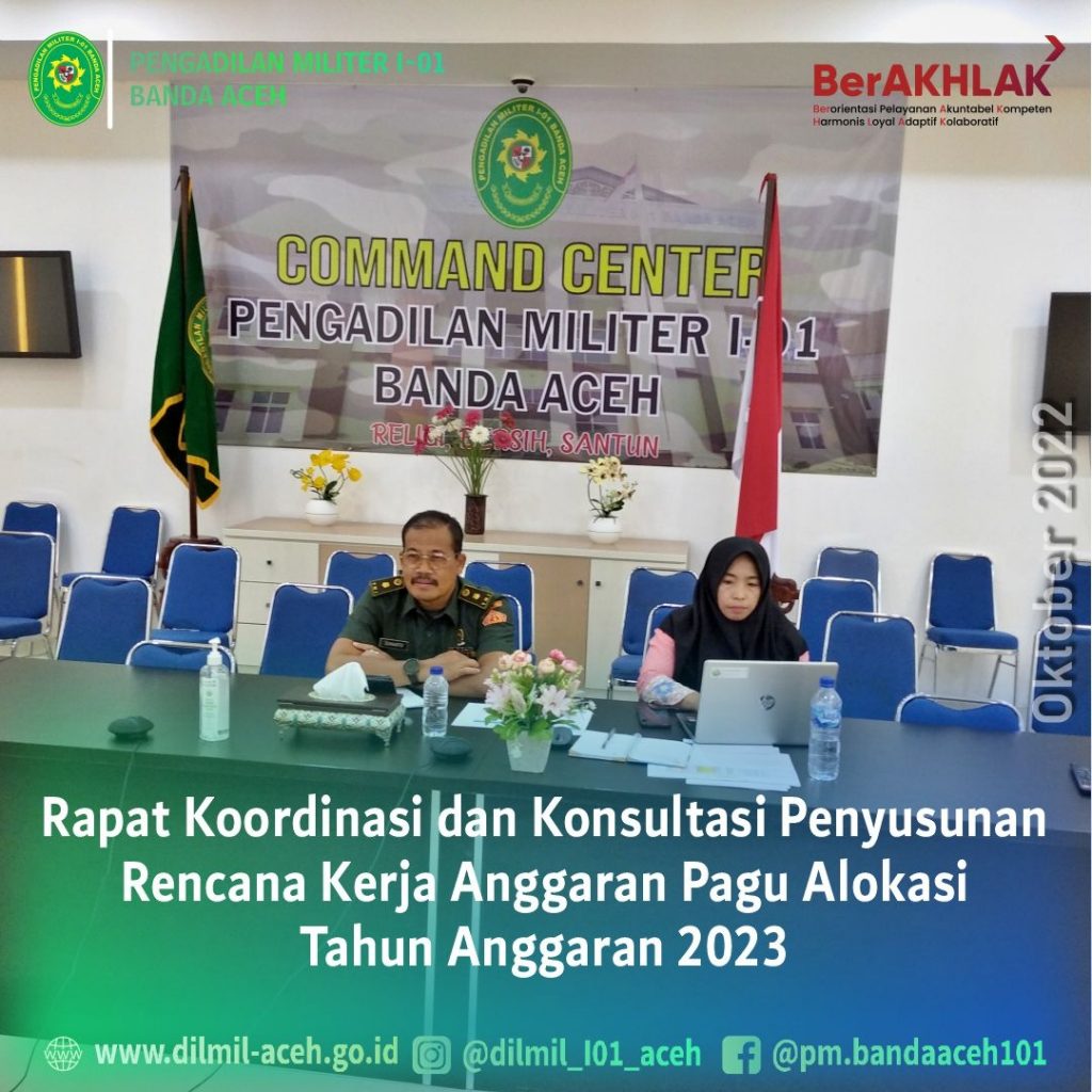 Banda Aceh – 13 Oktober 2022. Sekretaris Pengadilan Militer I-01 Banda Aceh Mayor Chk Sukarto, S.H. didampingi Kasubbag PTIP, Iin Subandia, S.E. mengikuti Rapat Koordinasi dan Konsultasi Penyusunan Rencana Kerja Anggaran Pagu Alokasi Tahun Anggaran 2023 secara daring yang diselenggarakan oleh Badan Urusan Administrasi Mahkamah Agung RI.