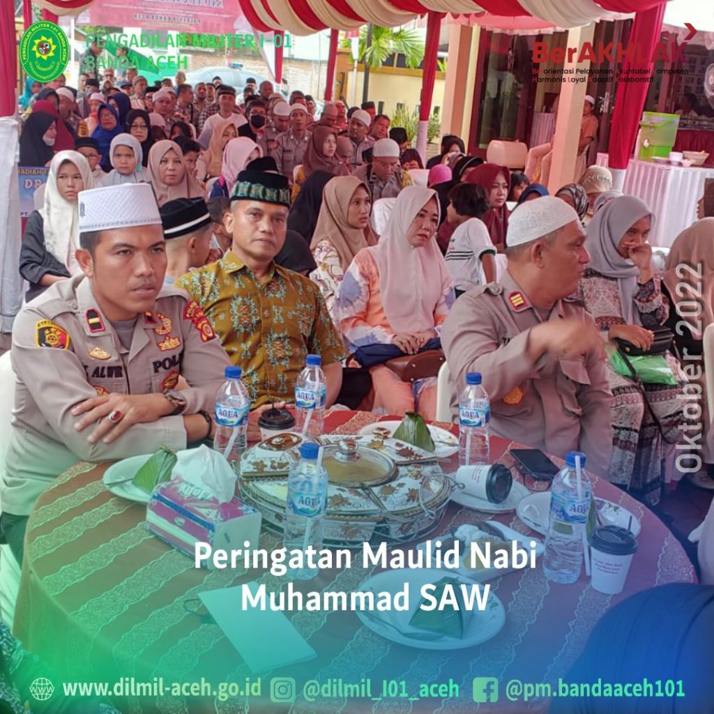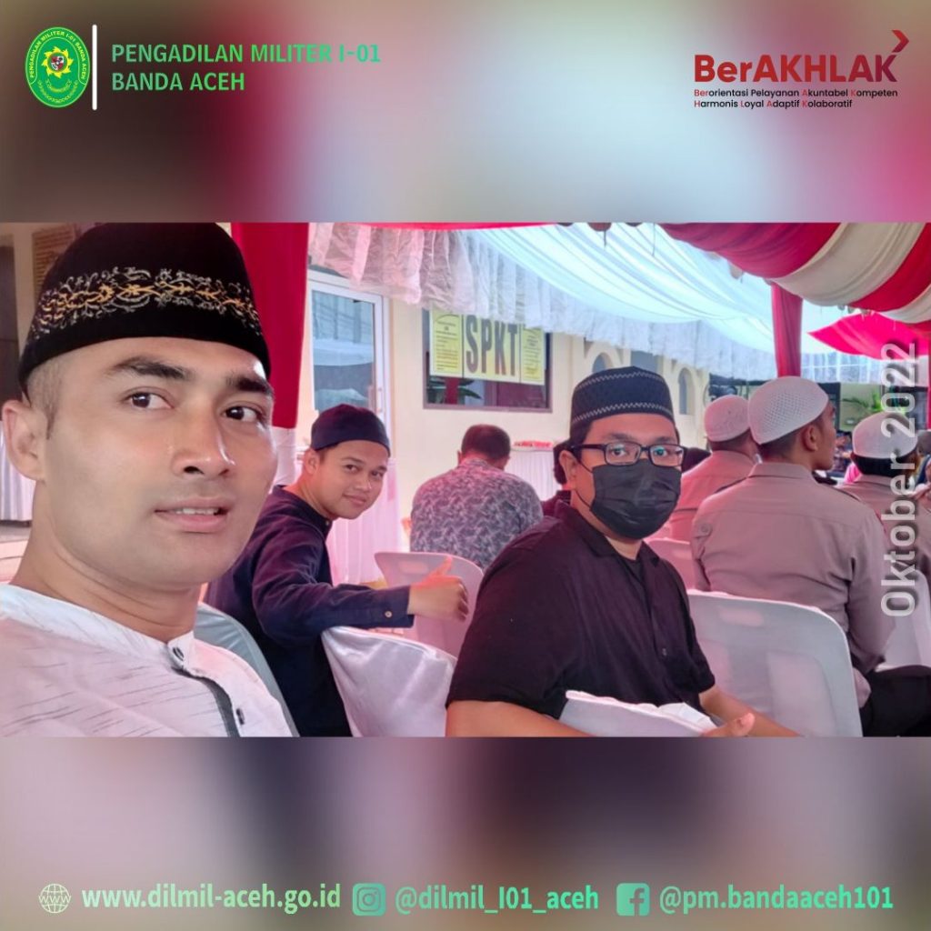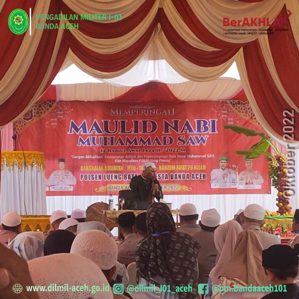 Banda Aceh – 16 Oktober 2022. Kadilmil I-01 Banda Aceh, Kolonel Chk Masykur, S.T., S.H., M.H. beserta staf menghadiri Undangan Kapolsek Lueng Bata dalam rangka kegiatan Maulid Nabi Muhammad SAW, bertempat di Mapolsek Lueng Bata.