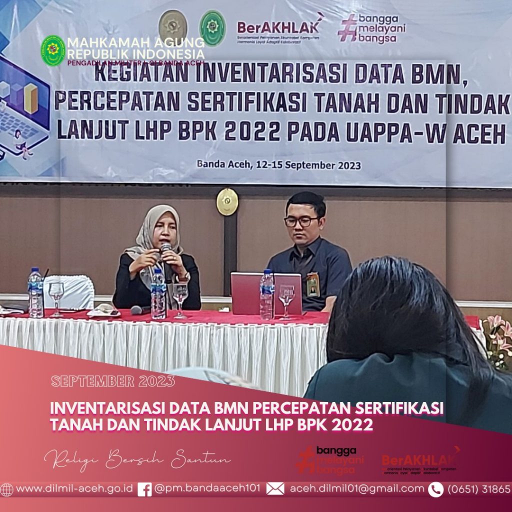 Banda Aceh – 12 September 2023. Sekretaris bersama Kasubbag Umum Keuangan dan Operator Sakti Dilmil I-01 Banda Aceh mengikuti kegiatan Inventarisasi Data BMN Percepatan Sertifikasi Tanah dan Tindak Lanjut LHP BPK 2022 bertempat di Mahkamah Syariah Aceh. Kegiatan ini berlangsung selama 3 hari mulai tanggal 12 s.d. 14 September 2023.