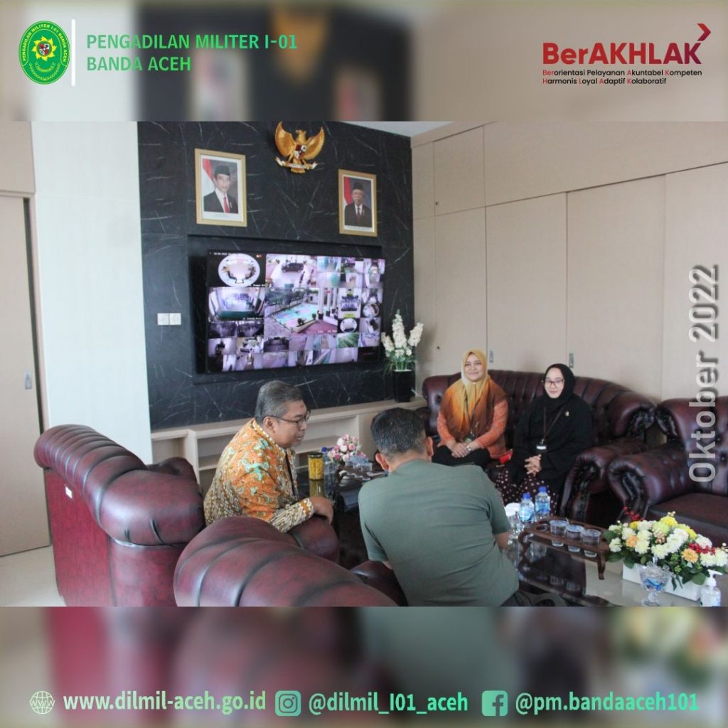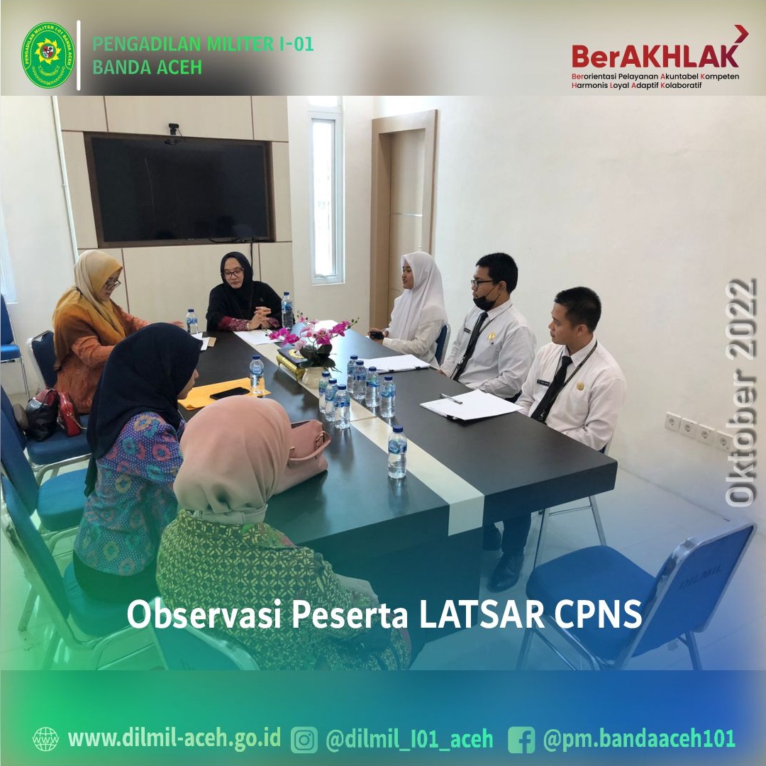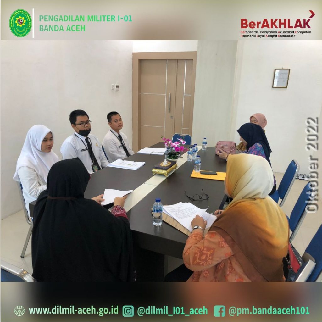 Banda Aceh – 27 September 2022, Pengadilan Militer I-01 Banda Aceh kedatangan tim dari Pusdiklat Manajemen dan Kepemimpinan Badan Litbang Diklat Hukum dan Peradilan Mahkamah Agung RI untuk melakukan observasi kepada Peserta Pelatihan Dasar (LATSAR) Calon Pegawai Negeri Sipil (CPNS) Pengadilan Militer I-01 Banda Aceh Tahun 2022 yaitu Irfan Dinata, A.Md. (Pengelola Perkara), Muhammad Fauzan Ramadhan Nasution, A.Md. (Pengelola Perkara) dan CPNS PTUN Banda Aceh Asshifa Ummami Kamaruzzaman, S.H.