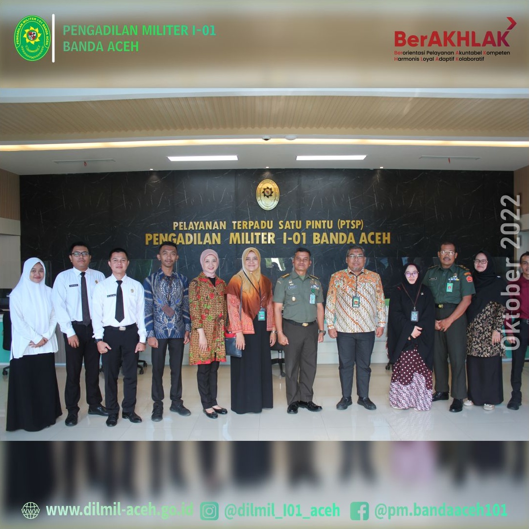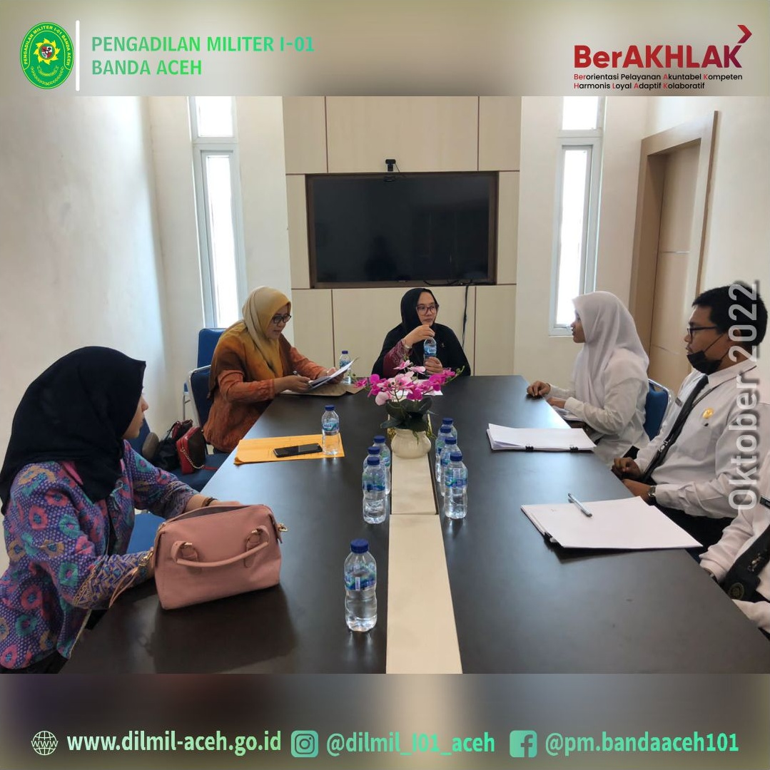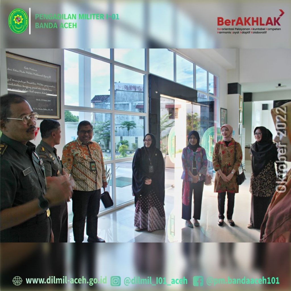 Banda Aceh – 27 September 2022, Pengadilan Militer I-01 Banda Aceh kedatangan tim dari Pusdiklat Manajemen dan Kepemimpinan Badan Litbang Diklat Hukum dan Peradilan Mahkamah Agung RI untuk melakukan observasi kepada Peserta Pelatihan Dasar (LATSAR) Calon Pegawai Negeri Sipil (CPNS) Pengadilan Militer I-01 Banda Aceh Tahun 2022 yaitu Irfan Dinata, A.Md. (Pengelola Perkara), Muhammad Fauzan Ramadhan Nasution, A.Md. (Pengelola Perkara) dan CPNS PTUN Banda Aceh Asshifa Ummami Kamaruzzaman, S.H.