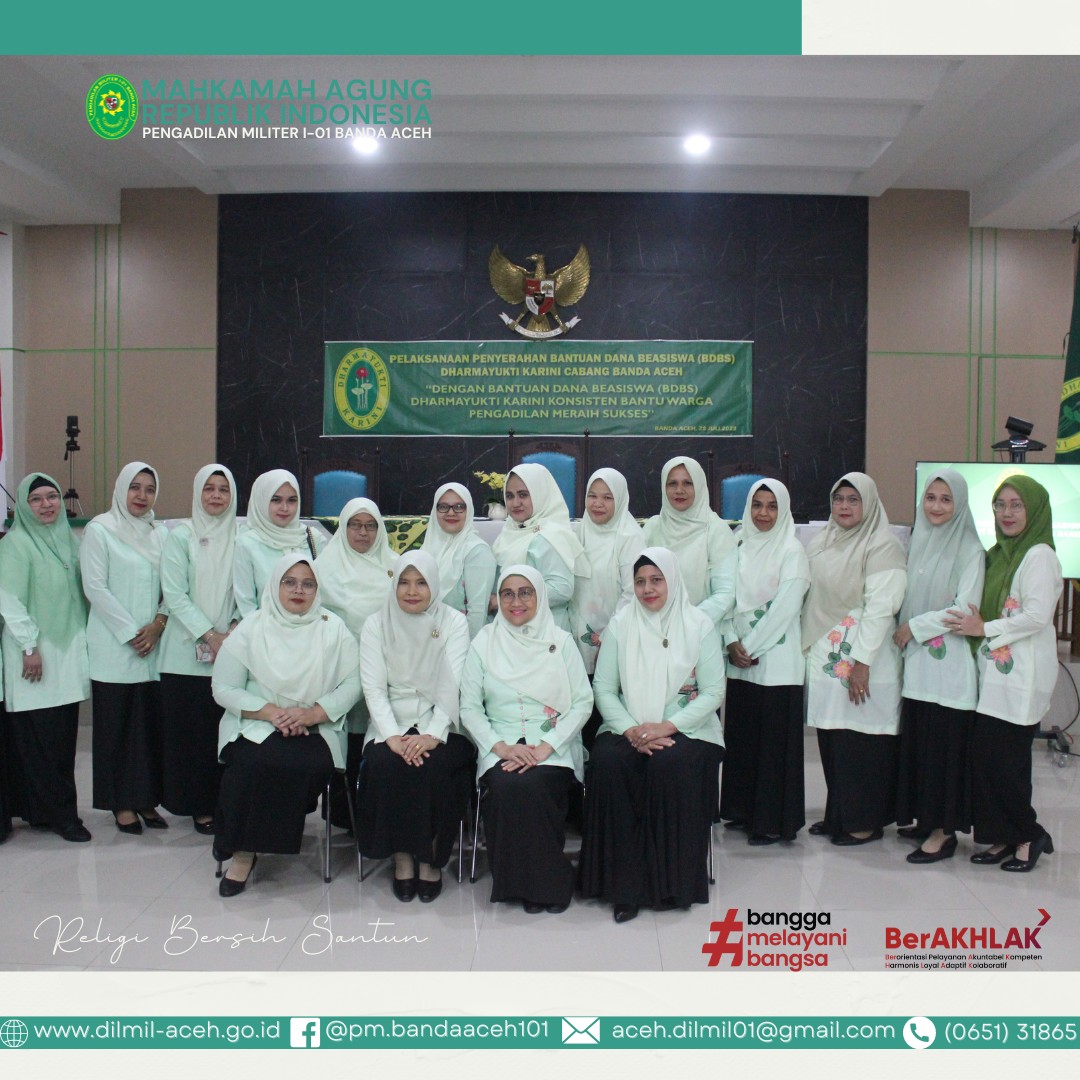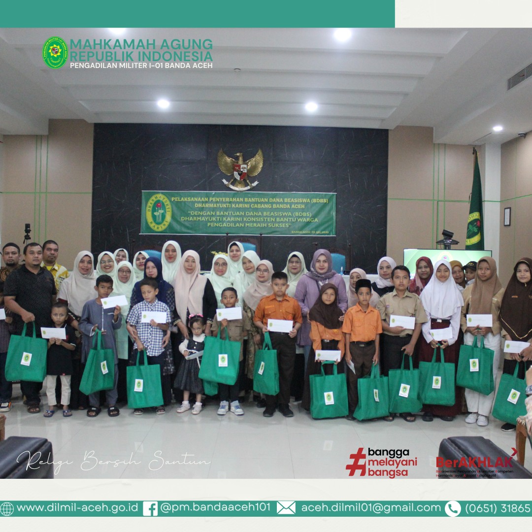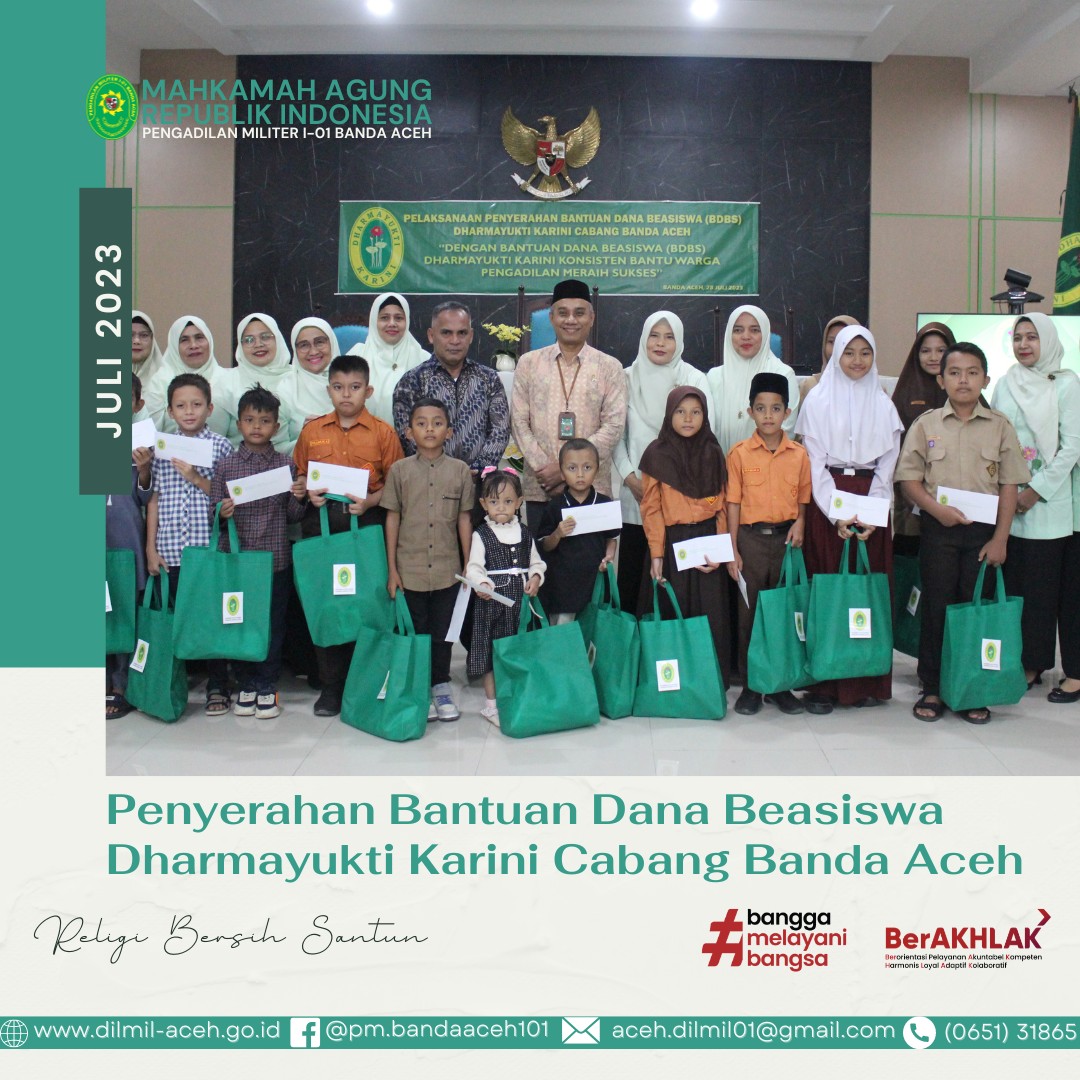 Banda Aceh – 28 Juli 2023. Dharmayukti Karini melaksanakan kegiatan Penyerahan Bantuan Dana Beasiswa (BDBS) cabang Banda Aceh Tahun Ajaran 2023 di Pengadilan Militer I-01 Banda Aceh yang bertemakan “Dengan Bantuan Dana Beasiswa (BDBS) Dharmayukti Karini Konsisten Bantu Warga Peradilan Meraih Sukses”. Melalui program bantuan dana beasiswa kita tingkatkan kepedulian untuk mewujudkan generasi emas warga peradilan.