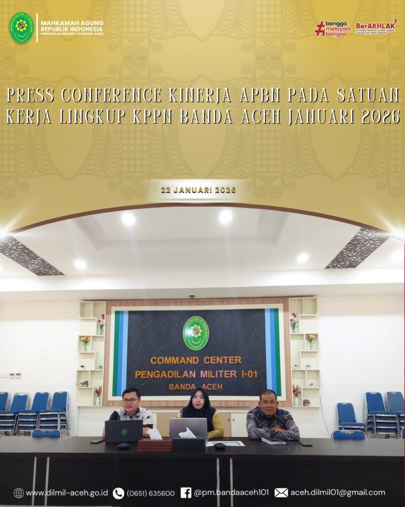 Banda Aceh – 22 Januari 2026. KPPN Banda Aceh menyelenggarakan Press Conference Kinerja APBN pada satuan kerja lingkup KPPN Banda Aceh untuk periode Januari 2026. Kegiatan ini dilaksanakan sebagai bagian dari penguatan peran KPPN Banda Aceh sebagai Treasurer, Regional Chief Economist, dan Financial Advisor di wilayah Aceh.