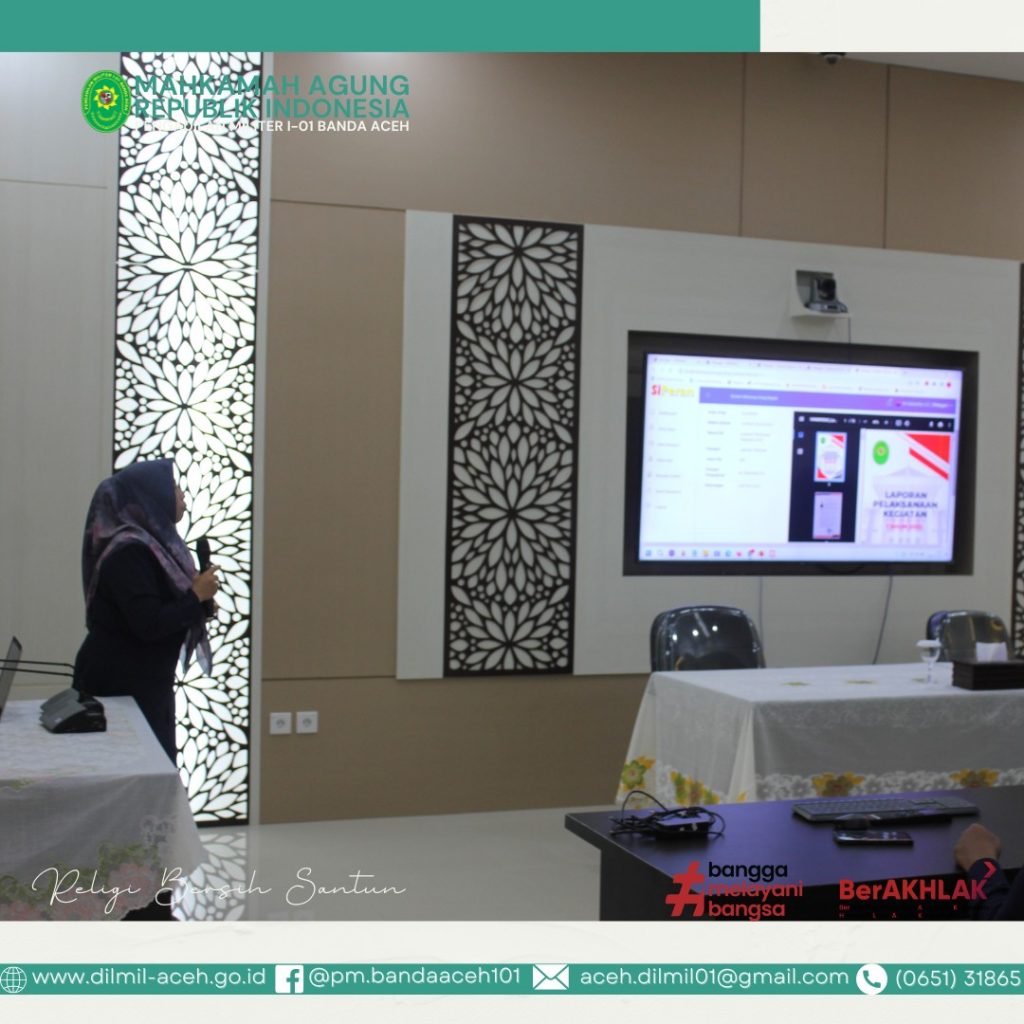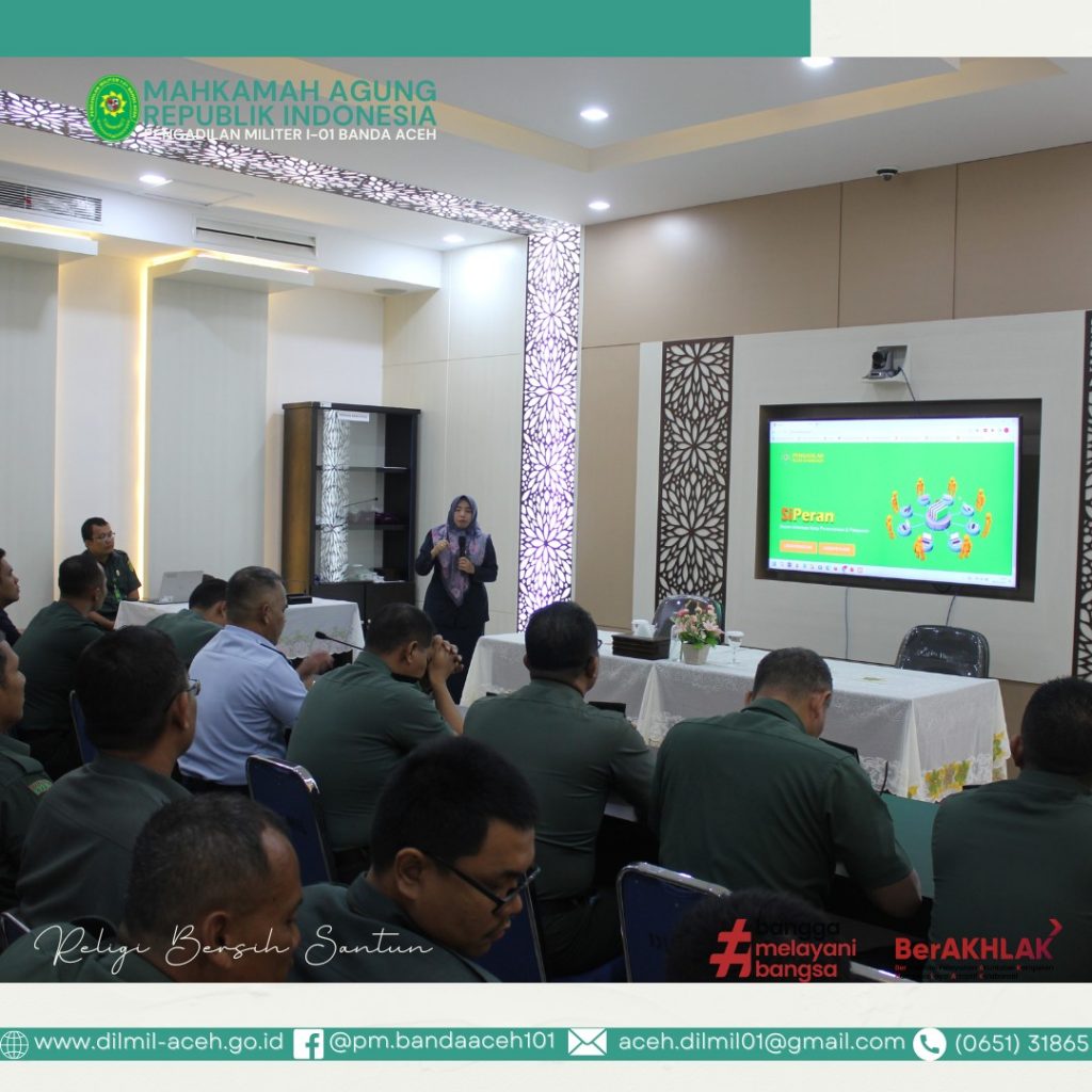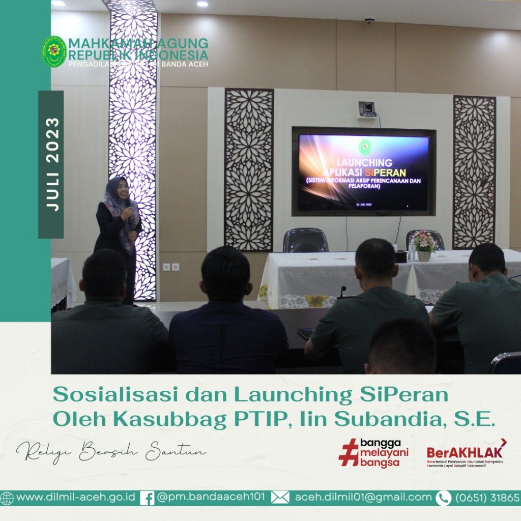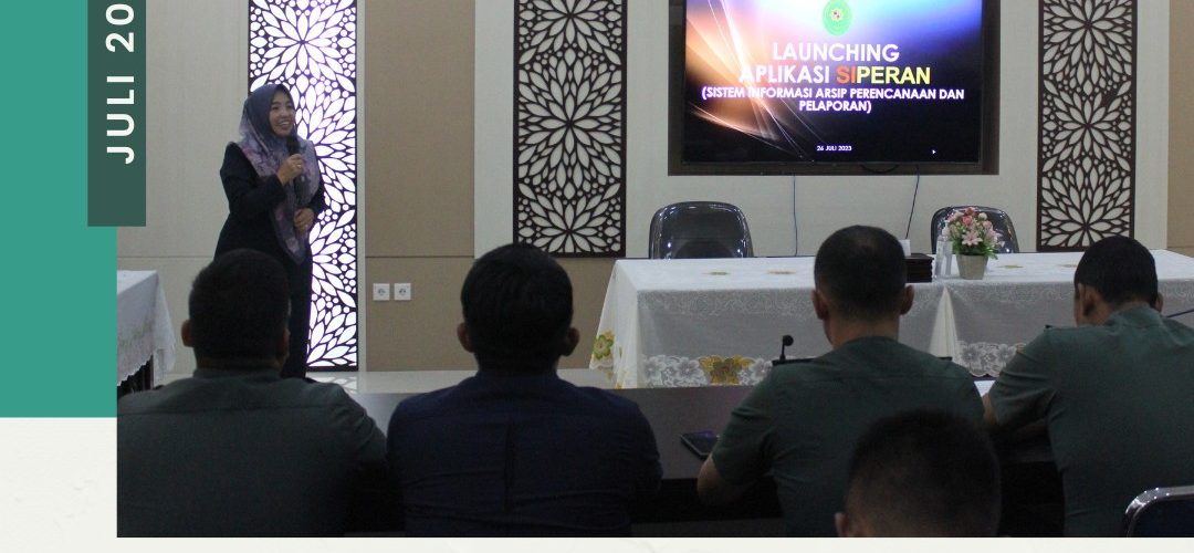 Banda Aceh – 26 Juli 2023. Kasubbag PTIP Dilmil I-01 Banda Aceh, Iin Subandia, S.E. sekaligus reformer aksi perubahan Diklat Pelatihan Kepemimpinan Pengawas (PKP) melaksanakan kegiatan Sosialisasi dan Launching SiPeran (Sistem Informasi Arsip dan Pelaporan) kepada pimpinan dan seluruh anggota Pengadilan Militer I-01 Banda Aceh bertempat di Auditorium Dilmil I-01 Banda Aceh.