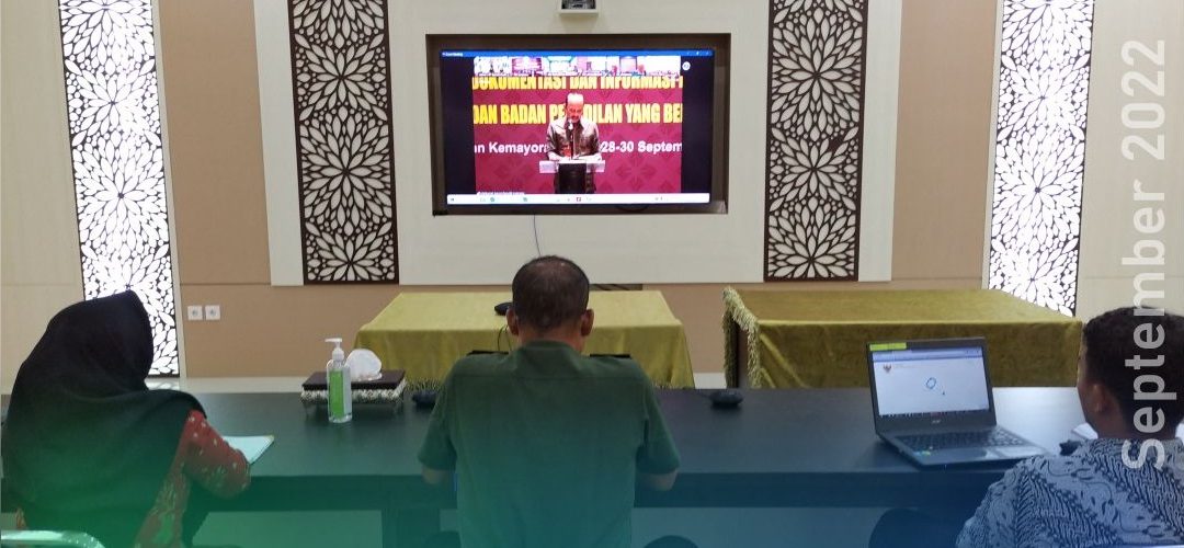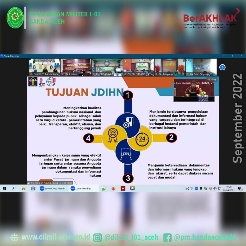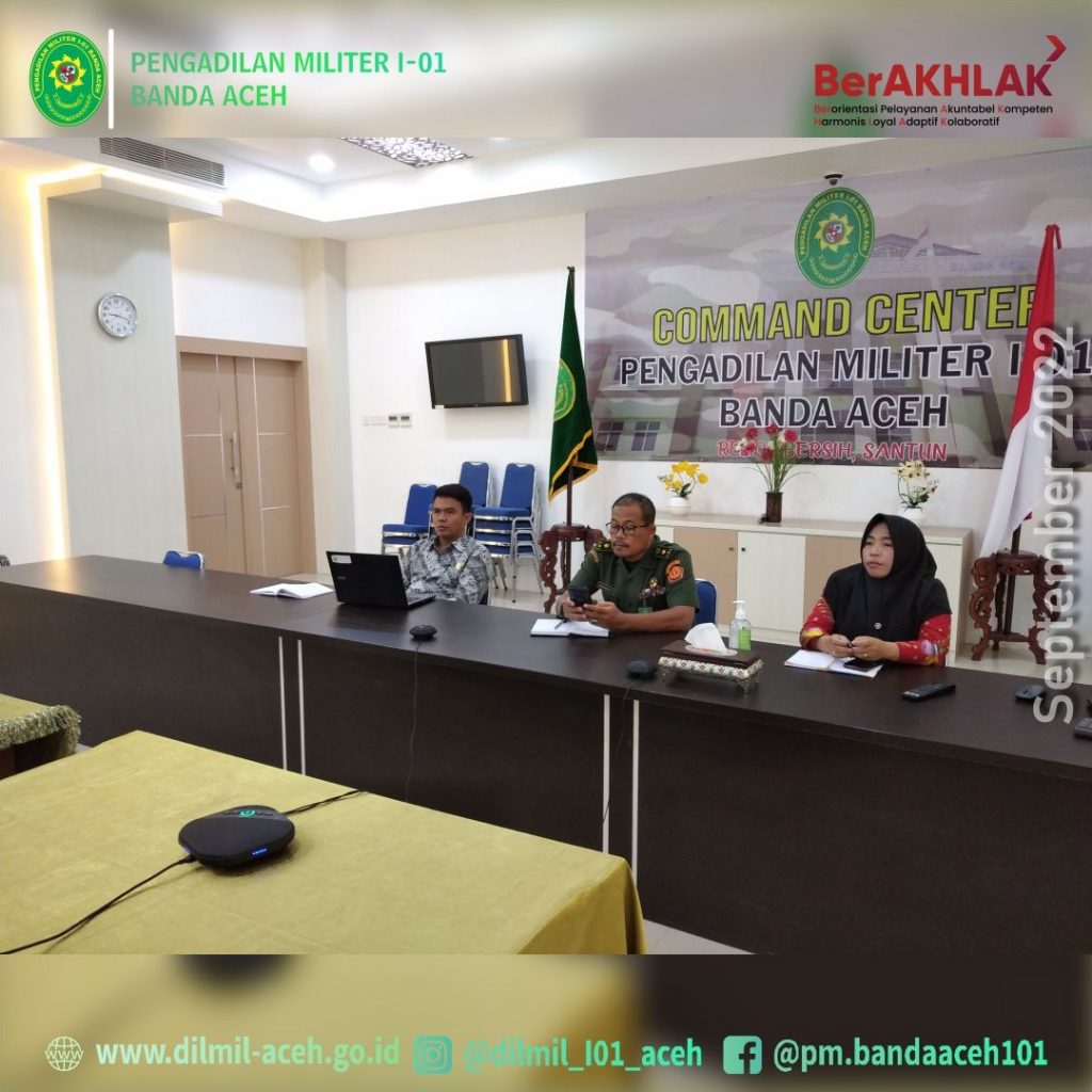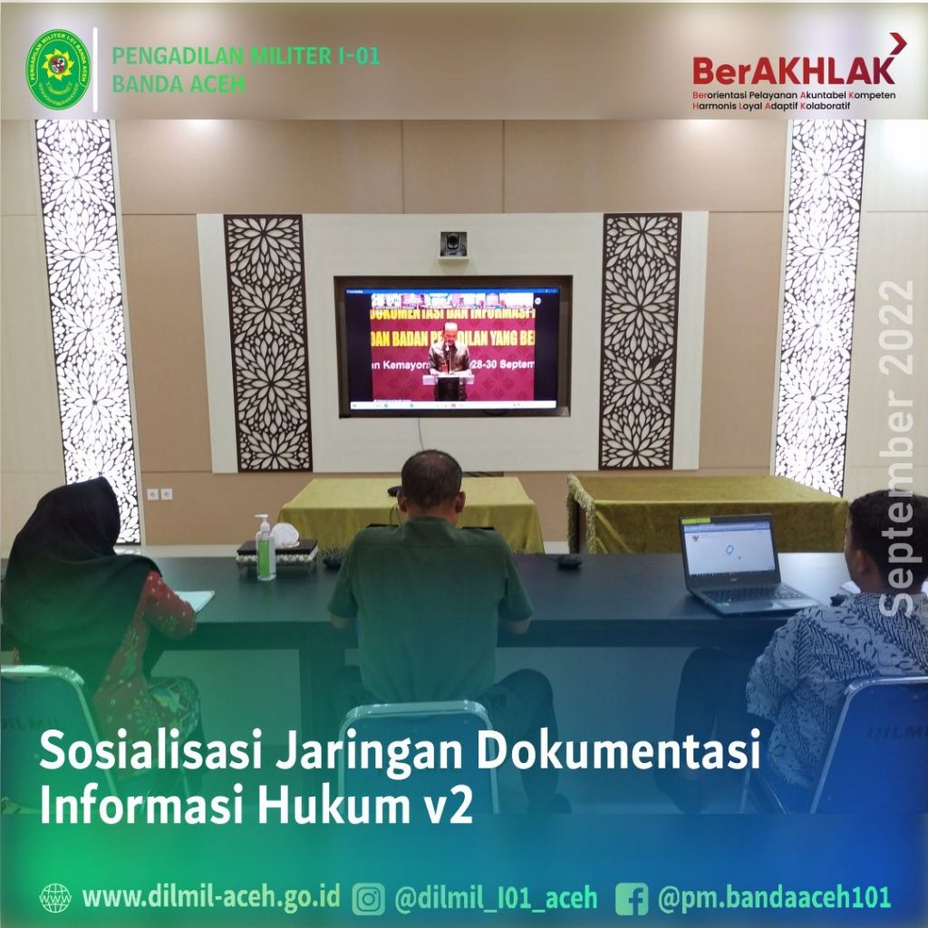 Banda Aceh – 29 September 2022 bertempat di ruang Auditorium, Sekretaris Dilmil I-01 Banda Aceh Mayor Chk Sukarto, S.H., Kasubbag PTIP, Iin Subandia, S.E., dan Plt. Kasubbag Kepegawaian, Supriyadi Koto, S.E., mengikuti Sosialisasi Jaringan Dokumentasi dan Indormasi Hukum versi 2 di Lingkungan Mahkamah Agung dan Badan Peradilan yang berada di bawahnya secara daring.