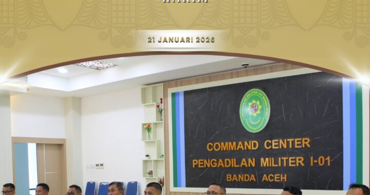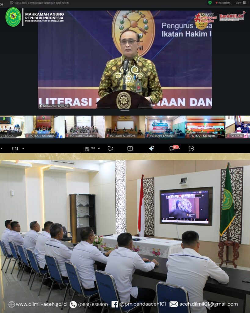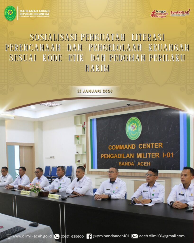 Banda Aceh – 21 Januari 2026. Pengadilan Militer I-01 Banda Aceh mengikuti kegiatan sosialisasi yang diselenggarakan oleh Pengurus Pusat Ikatan Hakim Indonesia (IKAHI) secara daring. Kegiatan ini bertujuan untuk memperkuat pemahaman terkait perencanaan dan pengelolaan keuangan serta Kode Etik dan Pedoman Perilaku Hakim.