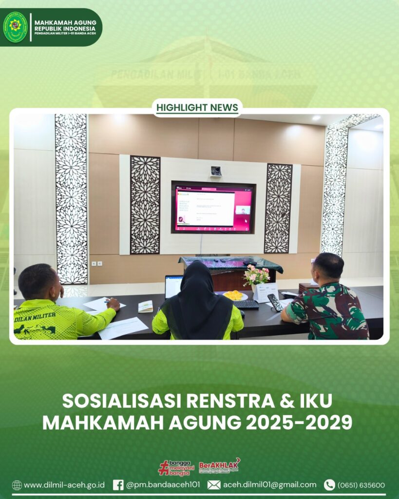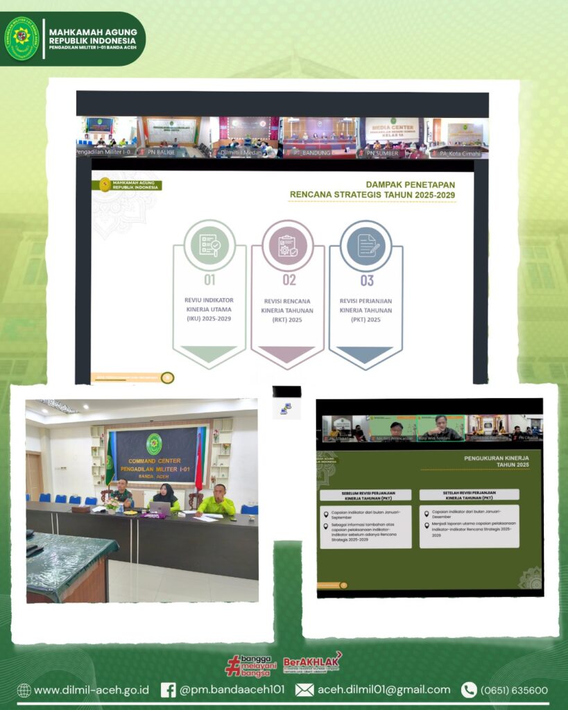 Banda Aceh – 3 Oktober 2025. Panitera didampingi Kasubbag PTIP mewakili Sekretaris Dilmil I-01 Banda Aceh mengikuti Kegiatan secara daring mengenai penyampaian Sosialisasi Rencana Strategis & Indikator Kinerja Utama Mahkamah Agung 2025-2029. Dalam sosialisasi tersebut, BUA Mahkamah Agung memaparkan arah kebijakan strategis, program prioritas, serta indikator kinerja utama yang menjadi acuan bagi seluruh satuan kerja peradilan di bawah Mahkamah Agung untuk periode 2025–2029. Hal ini bertujuan agar setiap pengadilan memiliki keselarasan visi, misi, serta langkah kerja yang terukur dalam rangka mewujudkan peradilan yang agung.