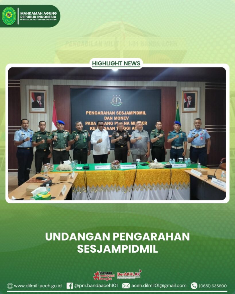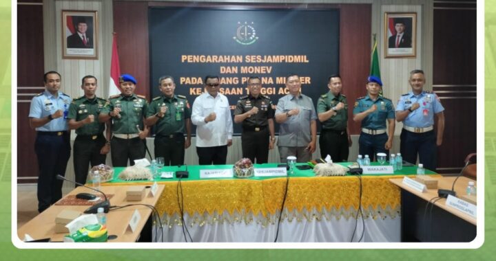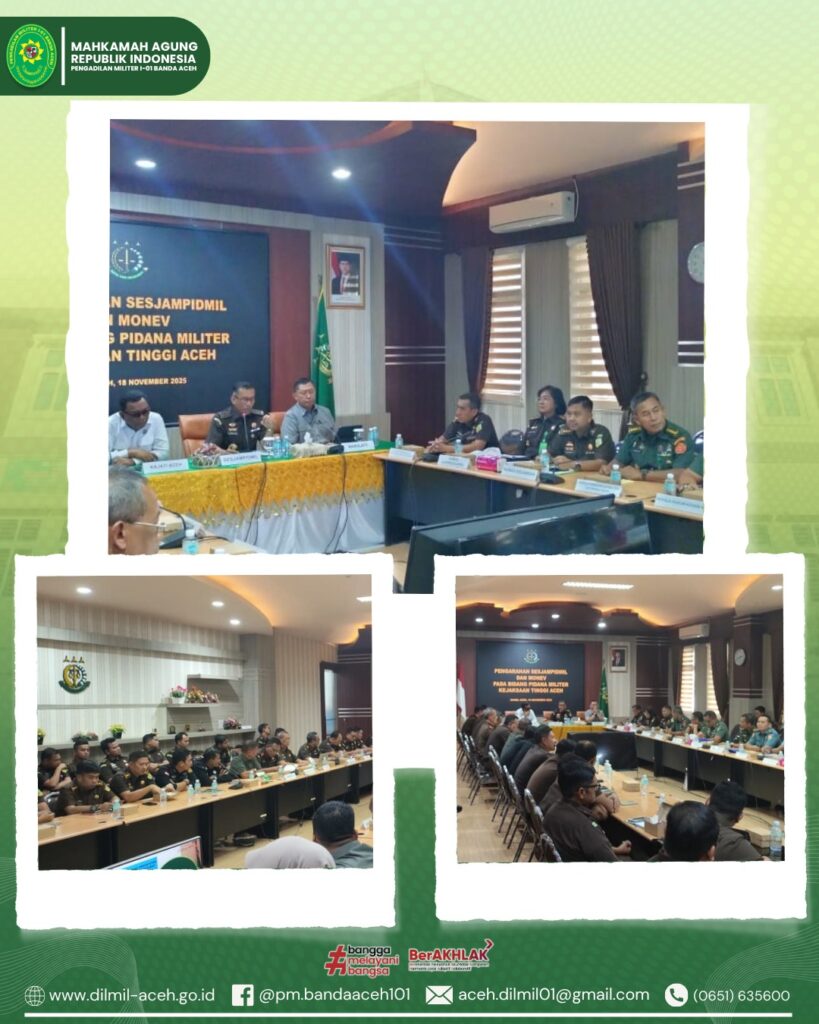 Banda Aceh – 18 November 2025. Pengadilan Militer I-01 Banda Aceh menghadiri kegiatan Pengarahan Sekretaris Jaksa Agung Muda Bidang Pidana Militer yang berlangsung di Ruang Rapat Kajati Tinggi Aceh. Acara ini dipimpin oleh Dr. Chaerul Amir, S.H., M.H., dalam rangka kunjungan kerja serta penguatan koordinasi antara aparat penegak hukum di bidang pidana militer. Kegiatan tersebut dihadiri langsung oleh Kadilmil I-01 Banda Aceh, Kolonel Chk Khamdan, S.Ag., S.H., M.H. Sebagai bentuk dukungan terhadap sinergi dan peningkatan kualitas penanganan perkara pidana militer di wilayah Aceh.